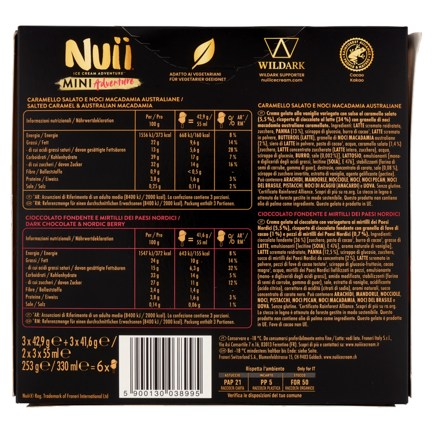 NUII Mini Adventure Caramello Salato e Noci Macadamia e Cioccolato Fondente e Mirtilli 6 Gelati 253g