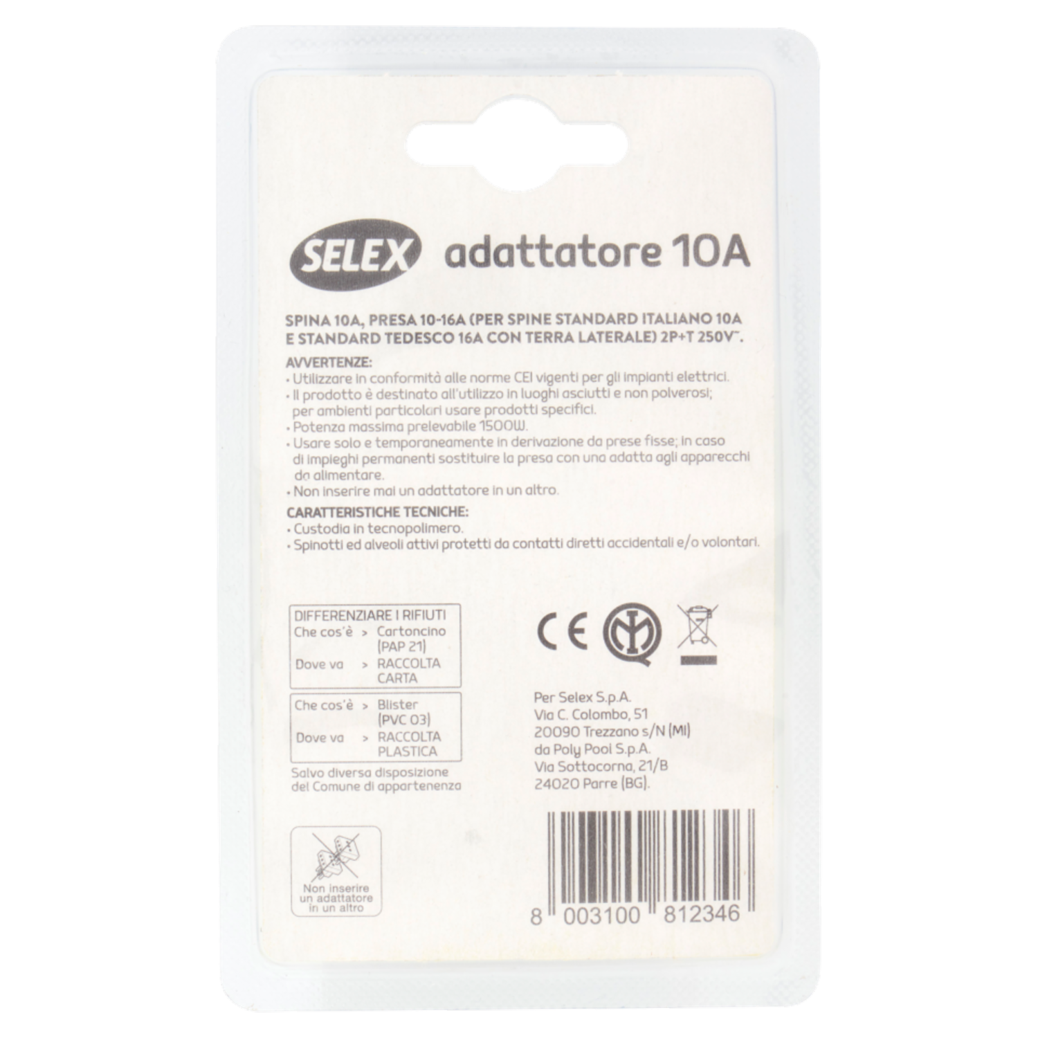 Selex Adattatore Semplice Spina 10A + 1 Presa 10-16A(Ted) Nero