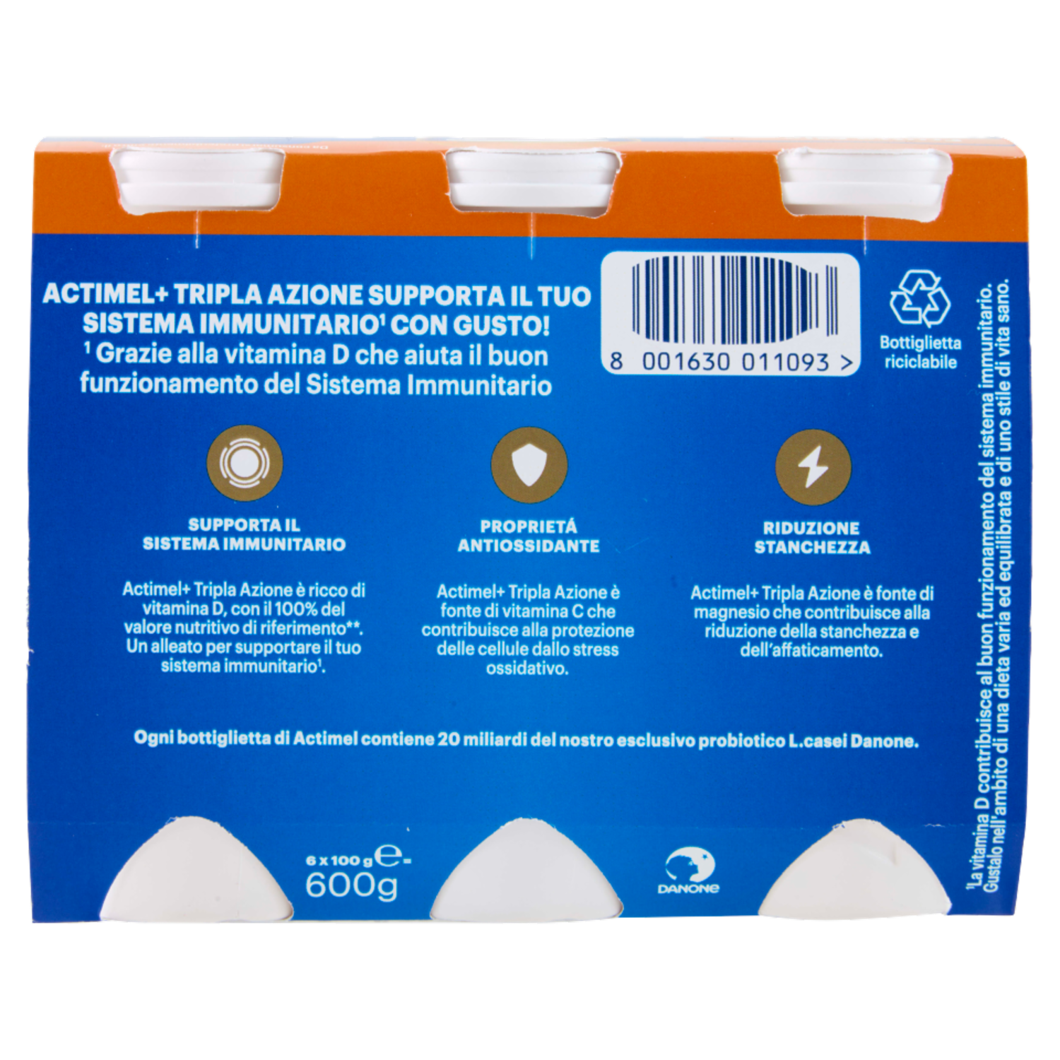 ACTIMEL Tripla Azione, Yogurt da Bere con Vitamine C, D e Magnesio, gusto Frutta mix, 6x100g