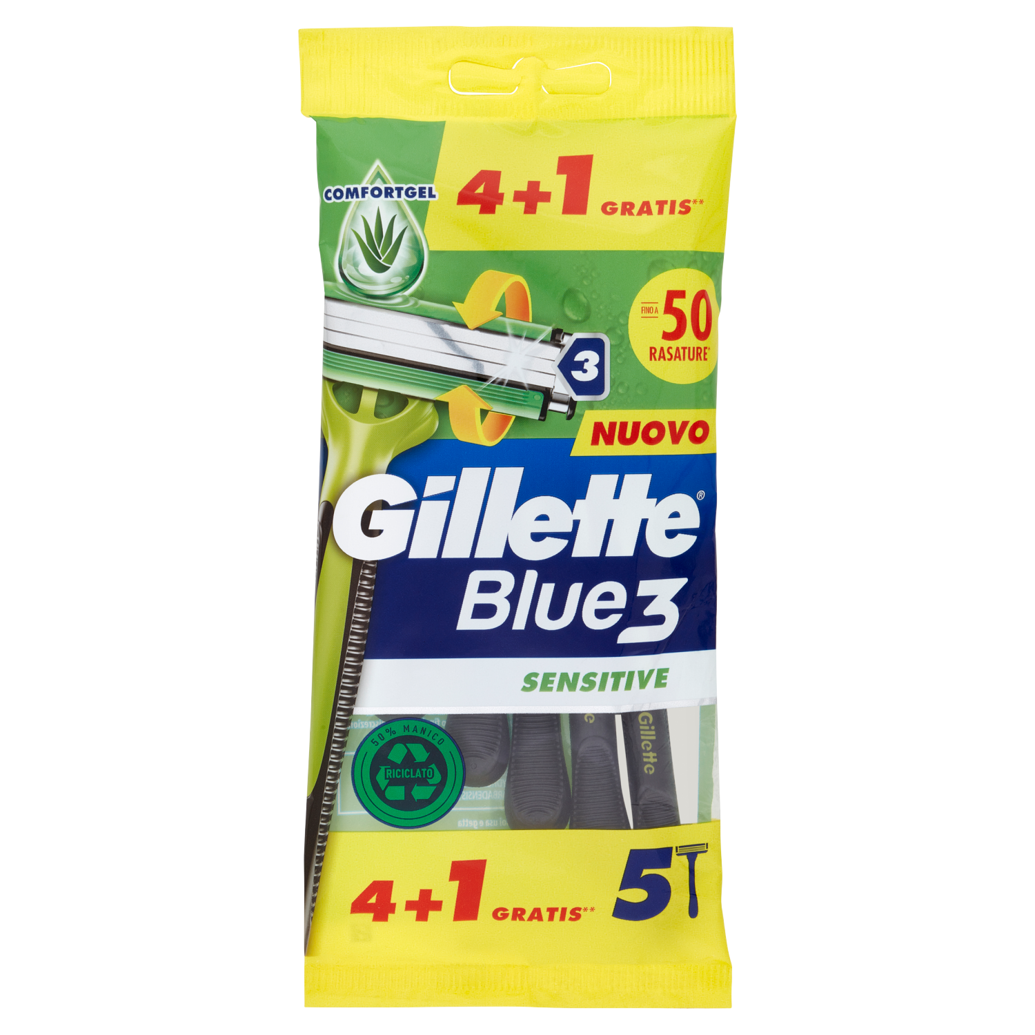 Gillette Rasoio Uomo Blue3 Sensitive Usa e Getta a 3 Lame, Confezione da 4 rasoi+1 Gratis = 5 Rasoi