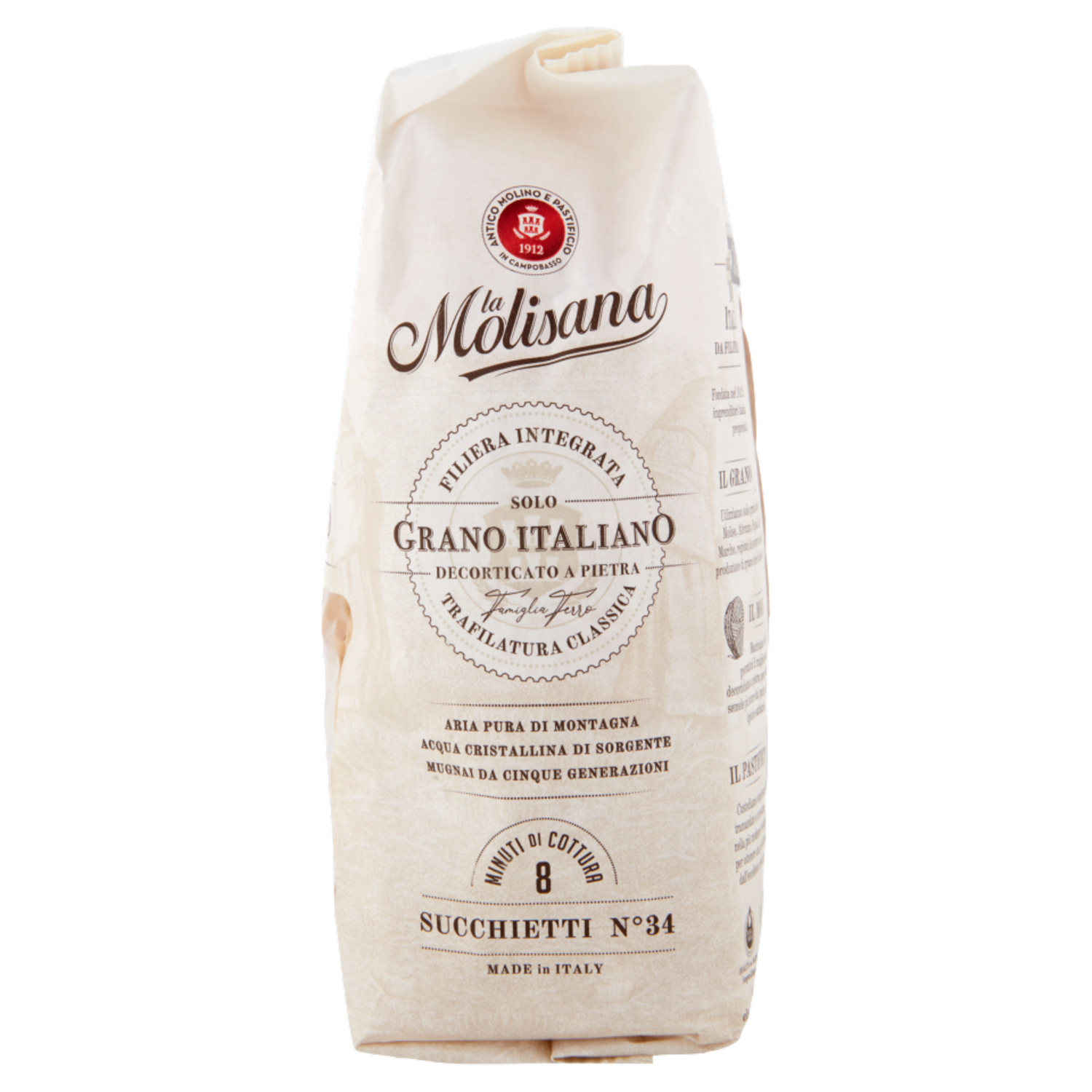 La Molisana Antico Molino e Pastificio in Campobasso 1912 Famiglia Ferro Azienda 100% italiana da filiera integrata Fondata nel 1912 da una famiglia di imprenditori italiani, interamente di proprietà italiana. Il grano Utilizziamo solo grano coltivato in Molise, Abruzzo, Puglia, Lazio e Marche, regioni da sempre vocate alla produzione di grano duro di alta qualità. Il molino Maciniamo da cinque generazioni il miglior grano, lo decortichiamo a pietra per produrre semole più sicure dal punto di vista igienico-sanitario. Il pastificio Custodiamo competenze tramandate e investiamo nella più moderna tecnologia per ottenere una pasta tenace e dall'eccellente tenuta in cottura. L'acqua Impastiamo le nostre semole con acqua pura, iposodica con caratteristiche oligominerali delle sorgenti del Matese. LifeGate impatto zero CO₂ La Molisana partecipa al progetto Impatto Zero di Lifegate grazie al quale sono state calcolate, ridotte e compensate le emissioni di CO2 derivanti dalla produzione di questa confezione, tramite l'acquisto di crediti di carbonio generati dalla creazione e tutela di foreste nel mondo. Aria pura di montagna Acqua cristallina di sorgente Mugnai da cinque generazioni