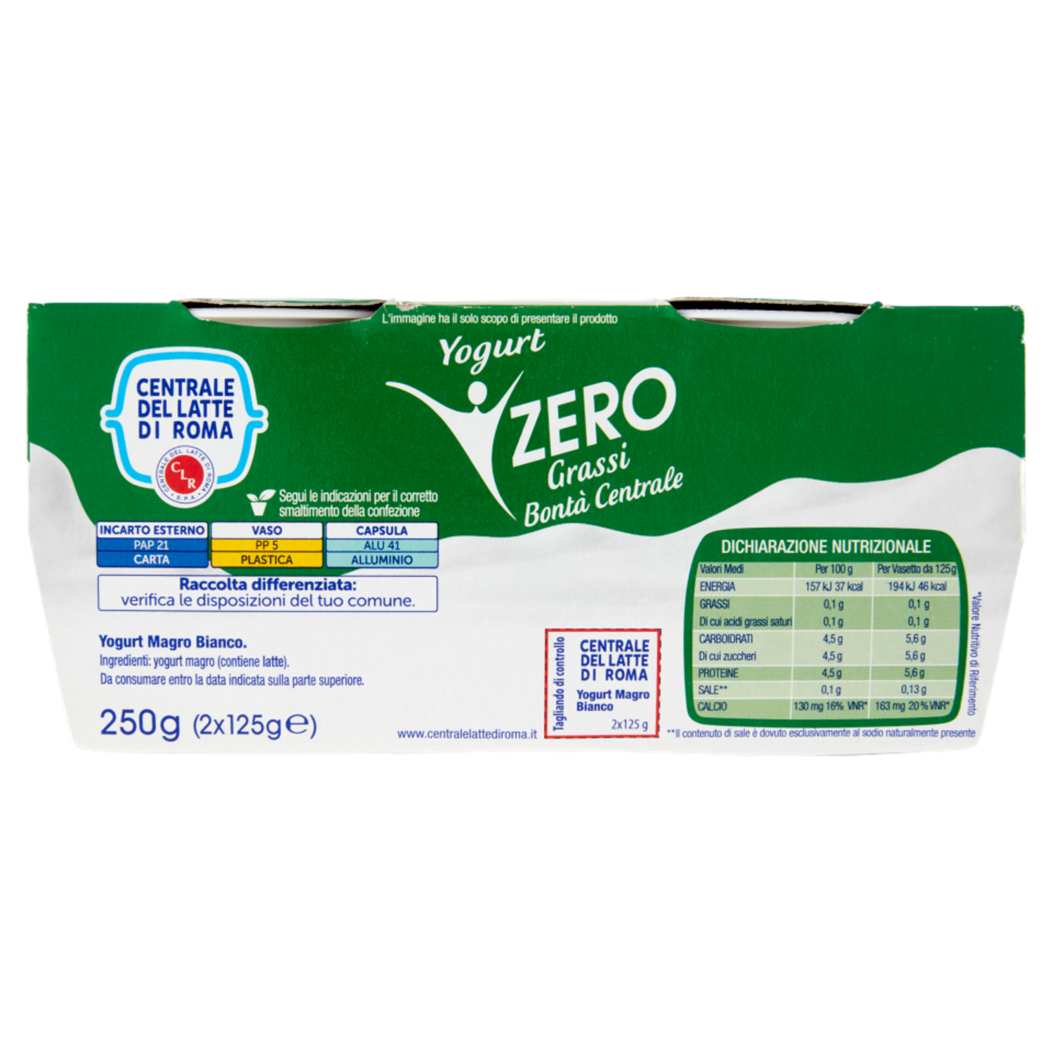 Centrale del Latte di Roma Zero Grassi Yogurt Magro Bianco 2 x 125 g