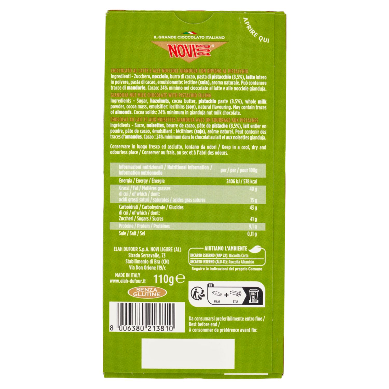 Novi Cuadro Pistacchio Tavoletta Cremino 110 g