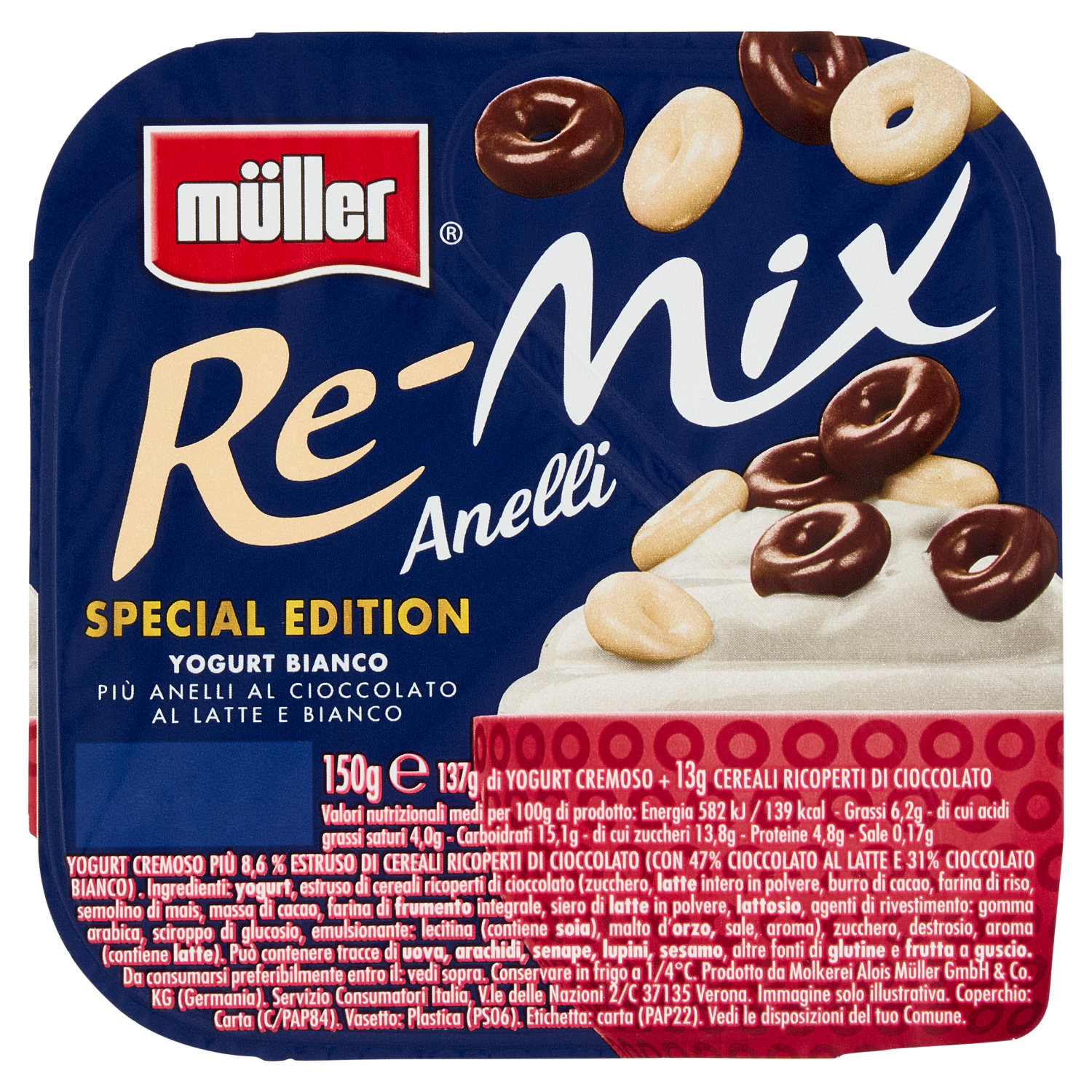müller Re-Mix Anelli Yogurt Bianco Più Anelli al Cioccolato Latte e Bianco 150 g