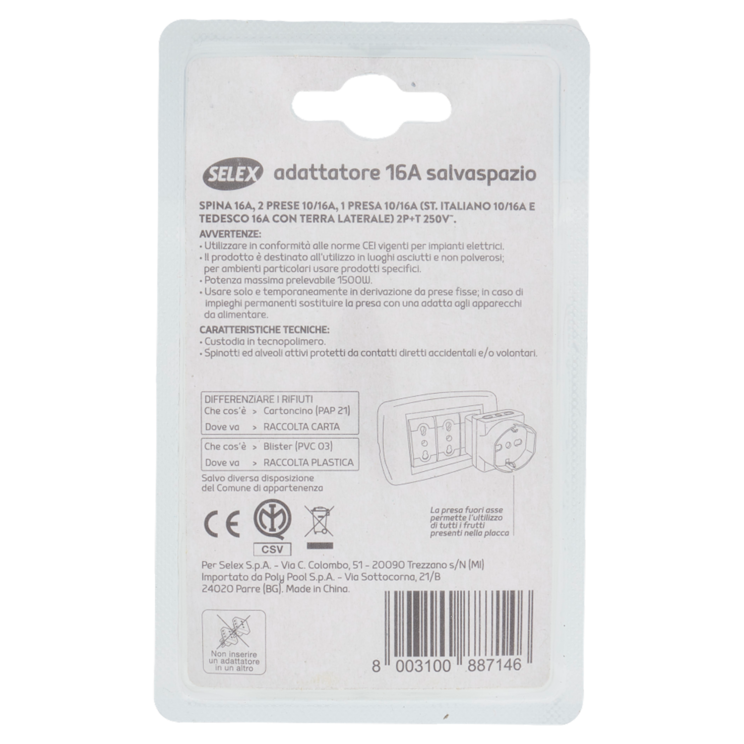 Selex Adattatore Pluristandard Spina 16A + 2 Prese 10/16A(Ita) + 1 presa 10-16A(Ted) Bianco