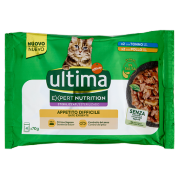 ultima Expert Nutrition Cat Sterilizzati Appetito Difficile con Tonno, con Pollo in Salsa 4 x 70 g