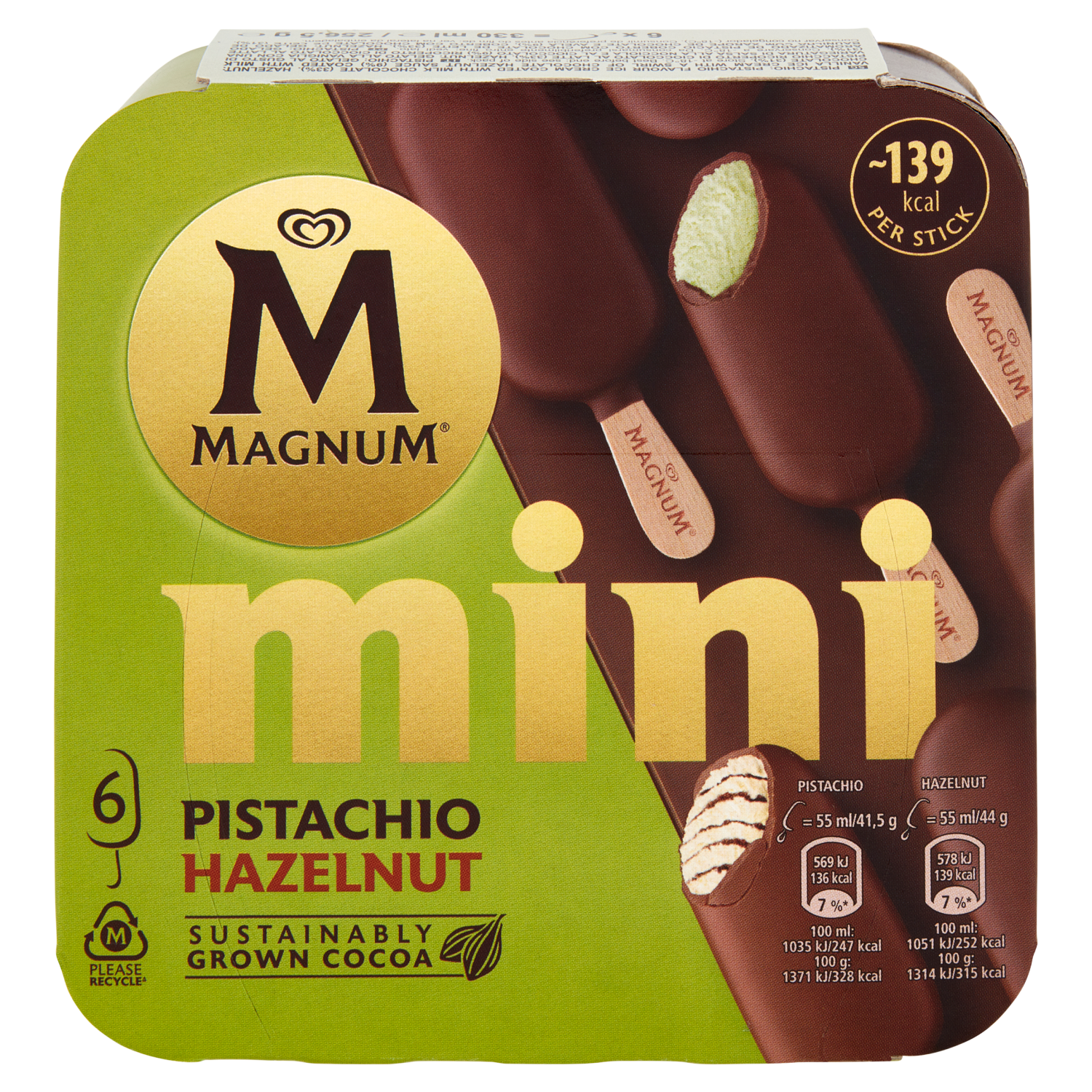 Pistacchio: Gelato al gusto di pistacchio ricoperto di cioccolato al latte (33%) Hazelnut: Gelato alla vaniglia con una variegatura di salsa alla nocciola e al cioccolato (9%) ricoperto di cioccolato al latte (31%)