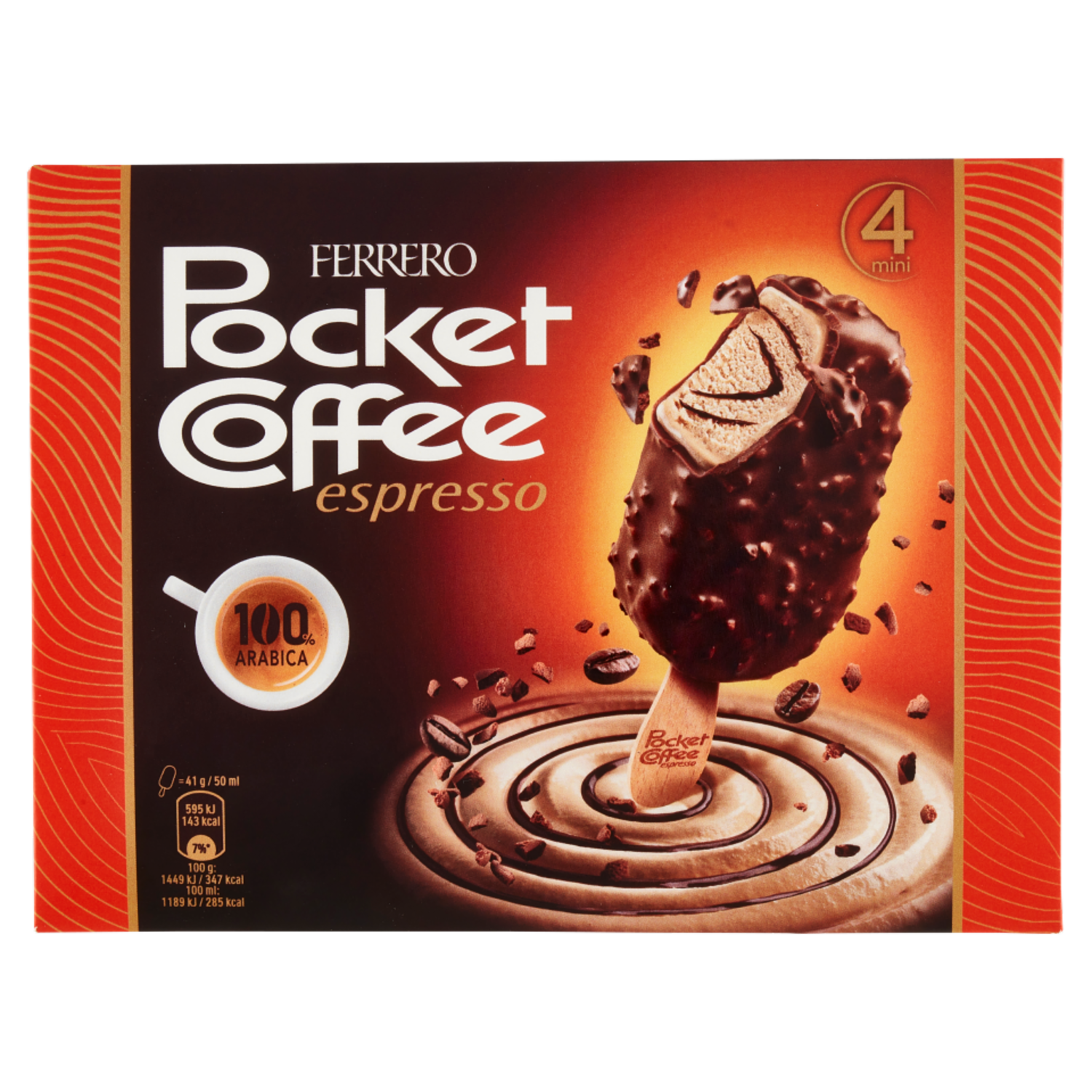 Gelato al caffé (52,8%) variegato al caffè ricoperto di cioccolato al latte e pepite al caffé