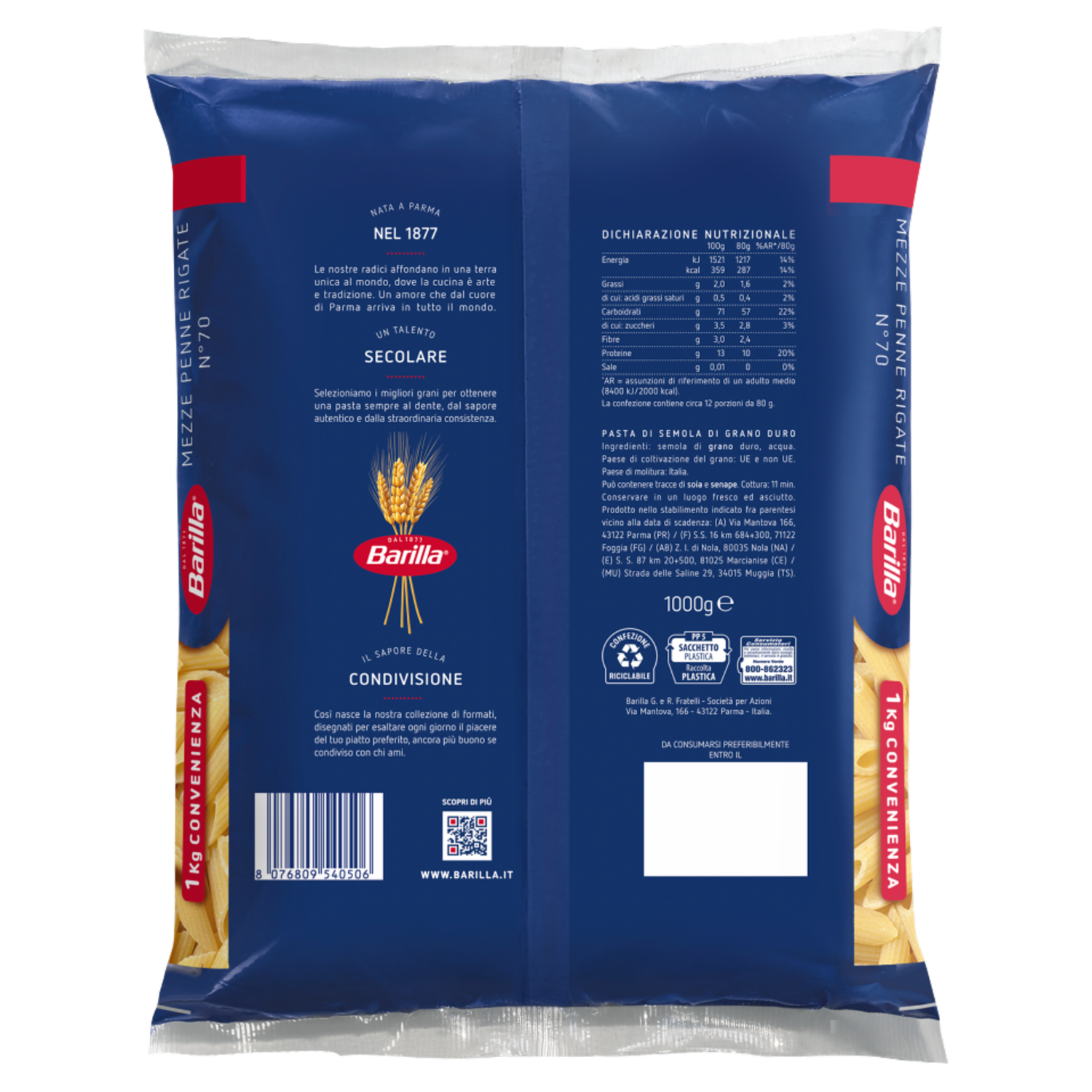 Barilla Pasta Mezze Penne Rigate n.70 CELLO CONV 1Kg