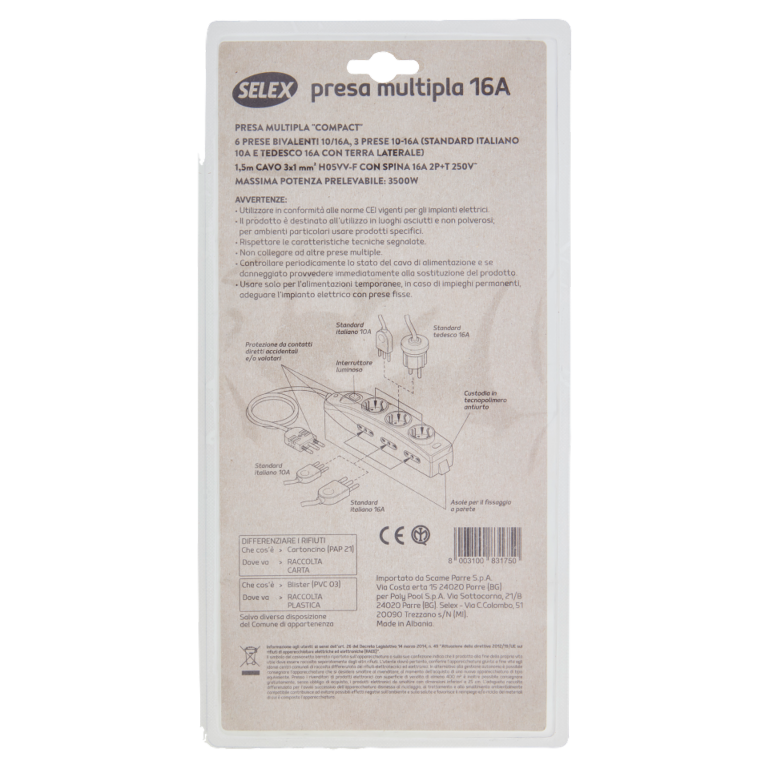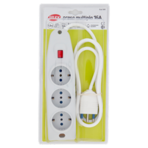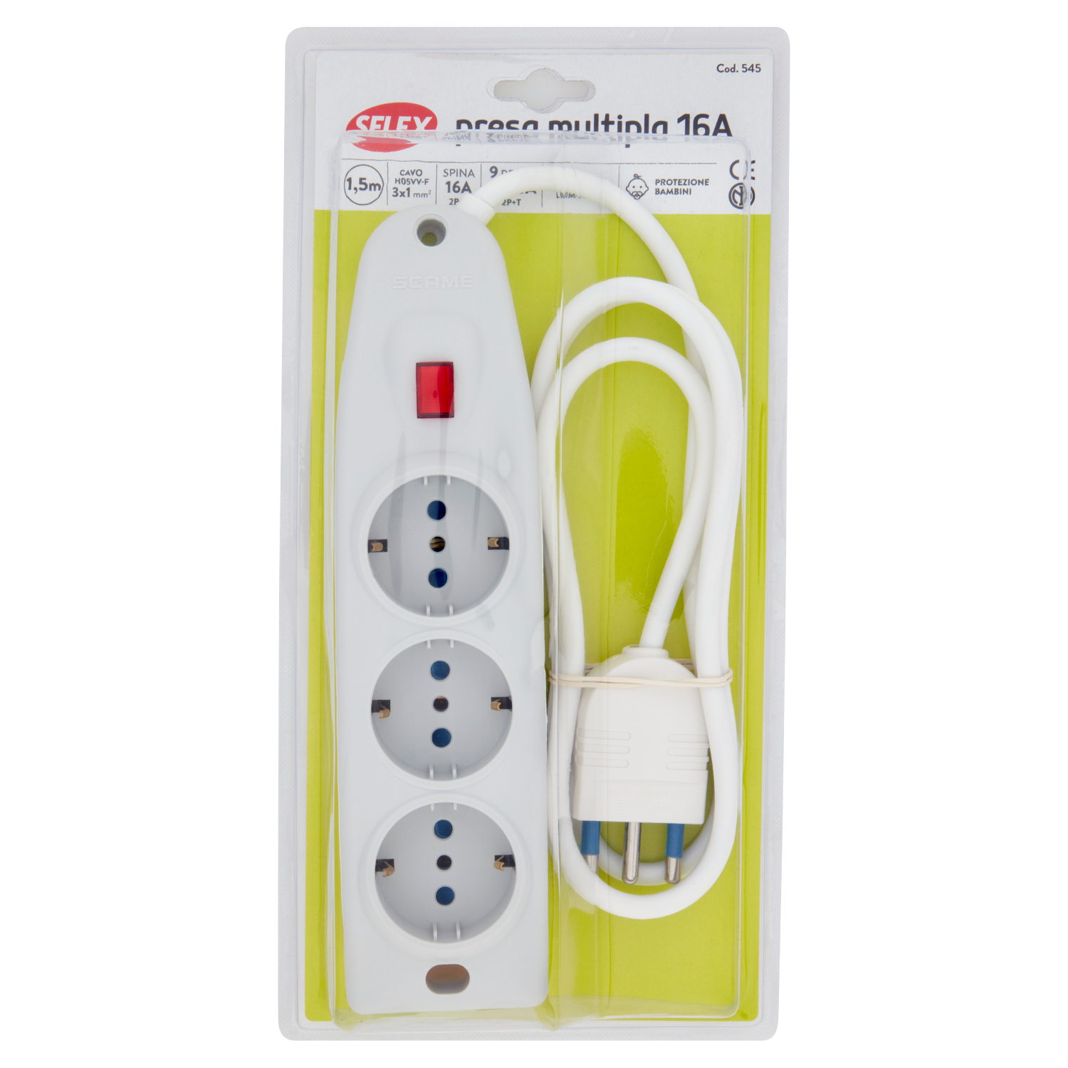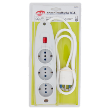 Selex Presa Multipla "Compact" 6 Uscite Bivalenti +3 Tedesche +Spina 16A, Interr. e Cavo 1,5m Bianco