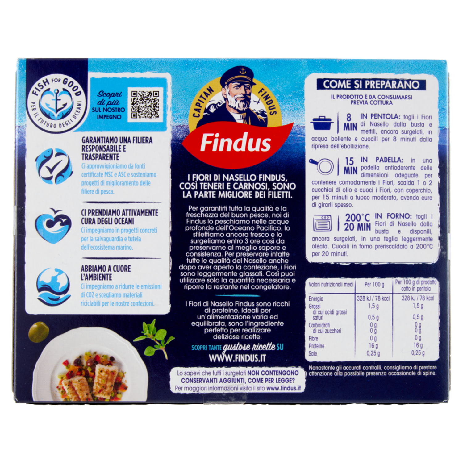 Fish for Good - Per il futuro degli oceani Scopri di più sul Nostro Impegno Garantiamo una filiera responsabile e trasparente Ci approvvigioniamo da fonti certificate MSC e ASC e sosteniamo progetti di miglioramento delle filiere di pesca. Ci prendiamo attivamente cura degli oceani Ci impegniamo in progetti concreti per la salvaguardia e tutela dell'ecosistema marino. Abbiamo a cuore l'ambiente Ci impegniamo ridurre le emissioni di CO2 e scegliamo materiali riciclabili per le nostre confezioni. Scopri Tante gustose ricette su www.findus.it Lo sapevi che tutti i surgelati Non Contengono Conservanti Aggiunti, Come per Legge? Per maggiori informazioni visita il sito www.findus.it