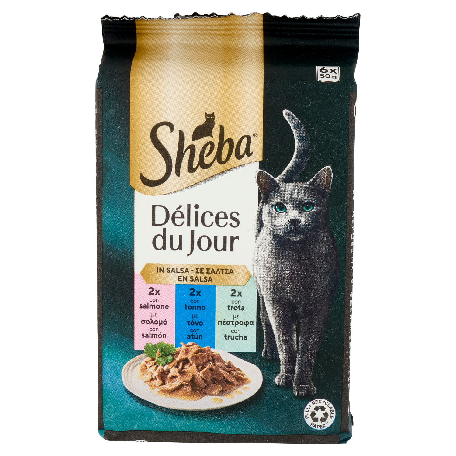 Sheba Délices du Jour Cibo Umido Gatto in Salsa con Salmone, Tonno e Trota 6 x 50 g