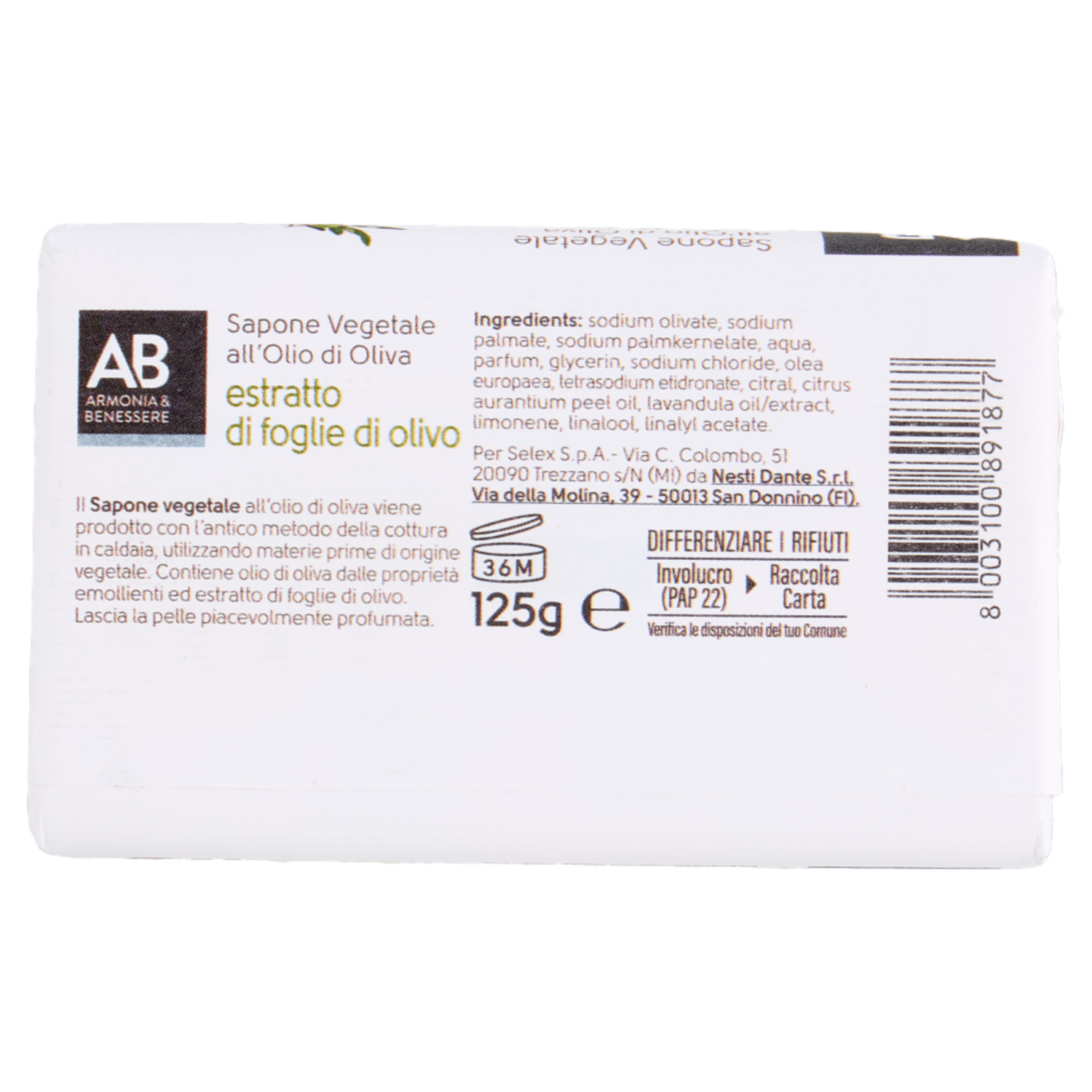 Armonia & Benessere Sapone Vegetale All'Olio di Oliva Estratto di Foglie di Olivo 125 g