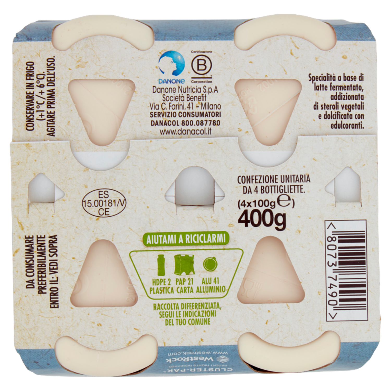 DANACOL Yogurt da bere, Riduce il Colesterolo grazie agli Steroli Vegetali, Bianco Naturale, 4x100g