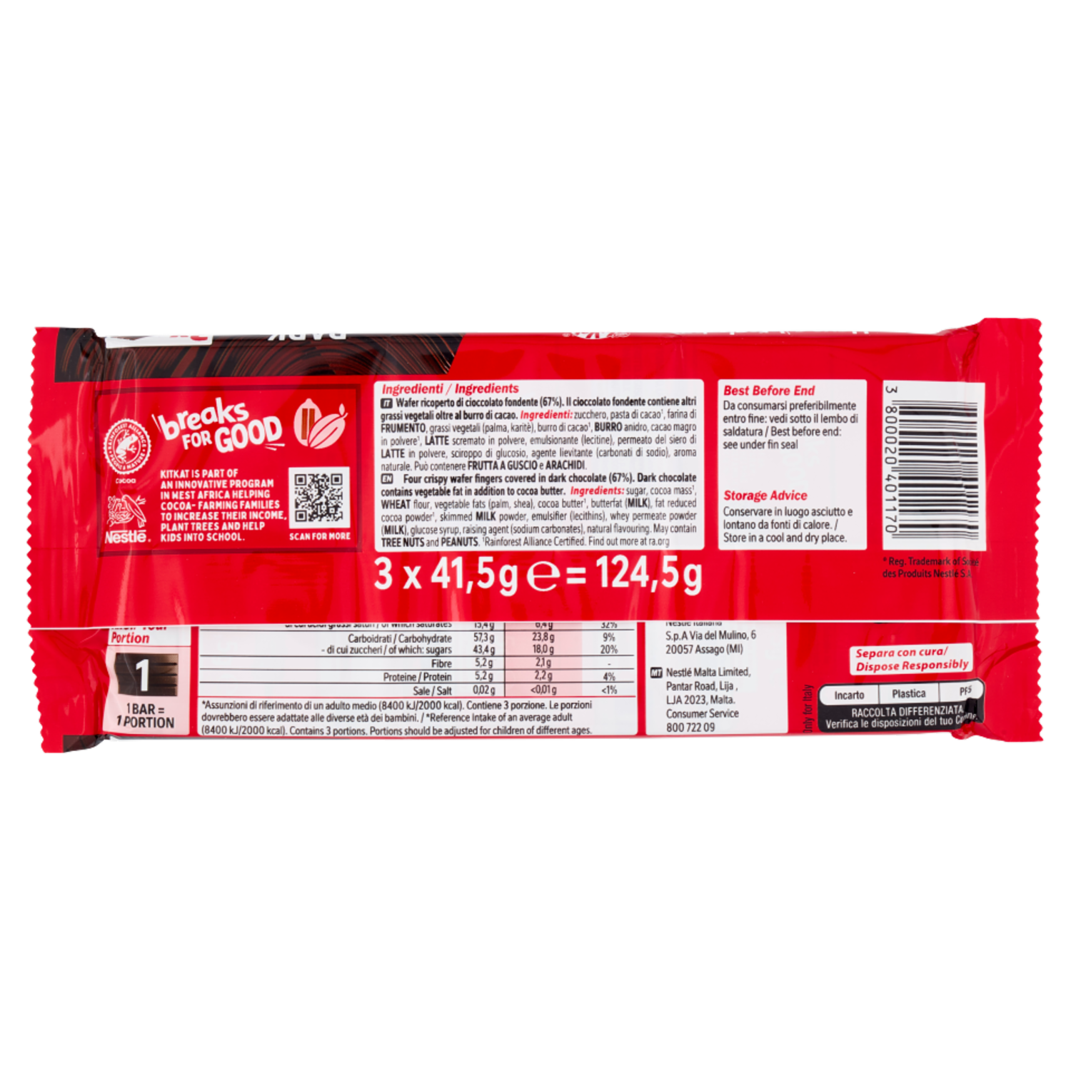 KITKAT Dark Wafer ricoperto di Cioccolato Fondente 3 Snack da 41,5g