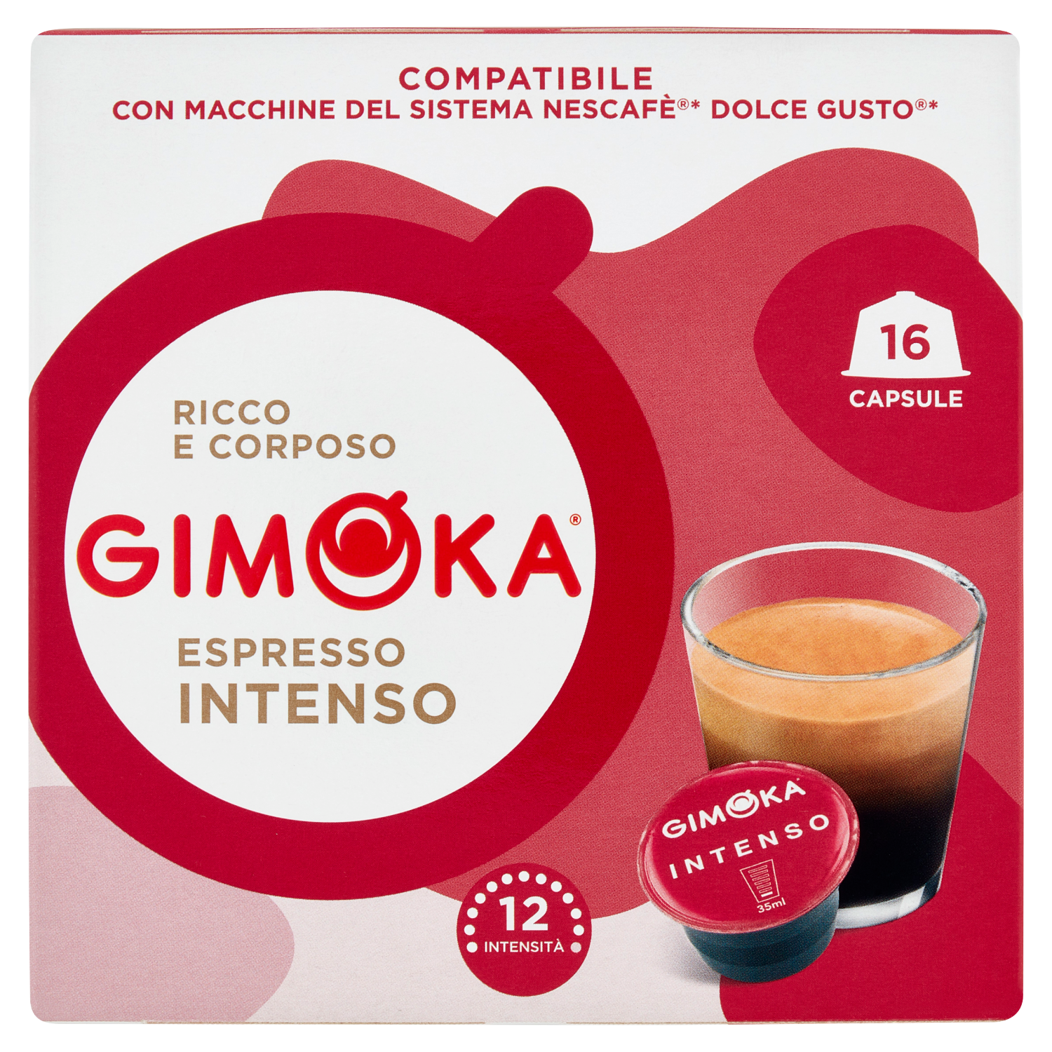 Capsule compatibili con le macchine ad uso domestico a marchio Nescafé* Dolce Gusto*. L'elenco dettagliato delle macchine compatibili è disponibile su www.gimoka.com. *Il marchio non è di proprietà di Gruppo Gimoka Srl né di aziende ad essa collegate. Tostatura scura Intensità 12 su 13 Arabica, Robusta Arabica: Brasile - Robusta: Uganda - Robusta: Vietnam Capsula Salvaroma La speciale barriera di cui è dotata la capsula, protegge il caffè dall'umidità e dall'aria salvaguardando nel tempo il bouquet di aromi e il gusto del caffè.