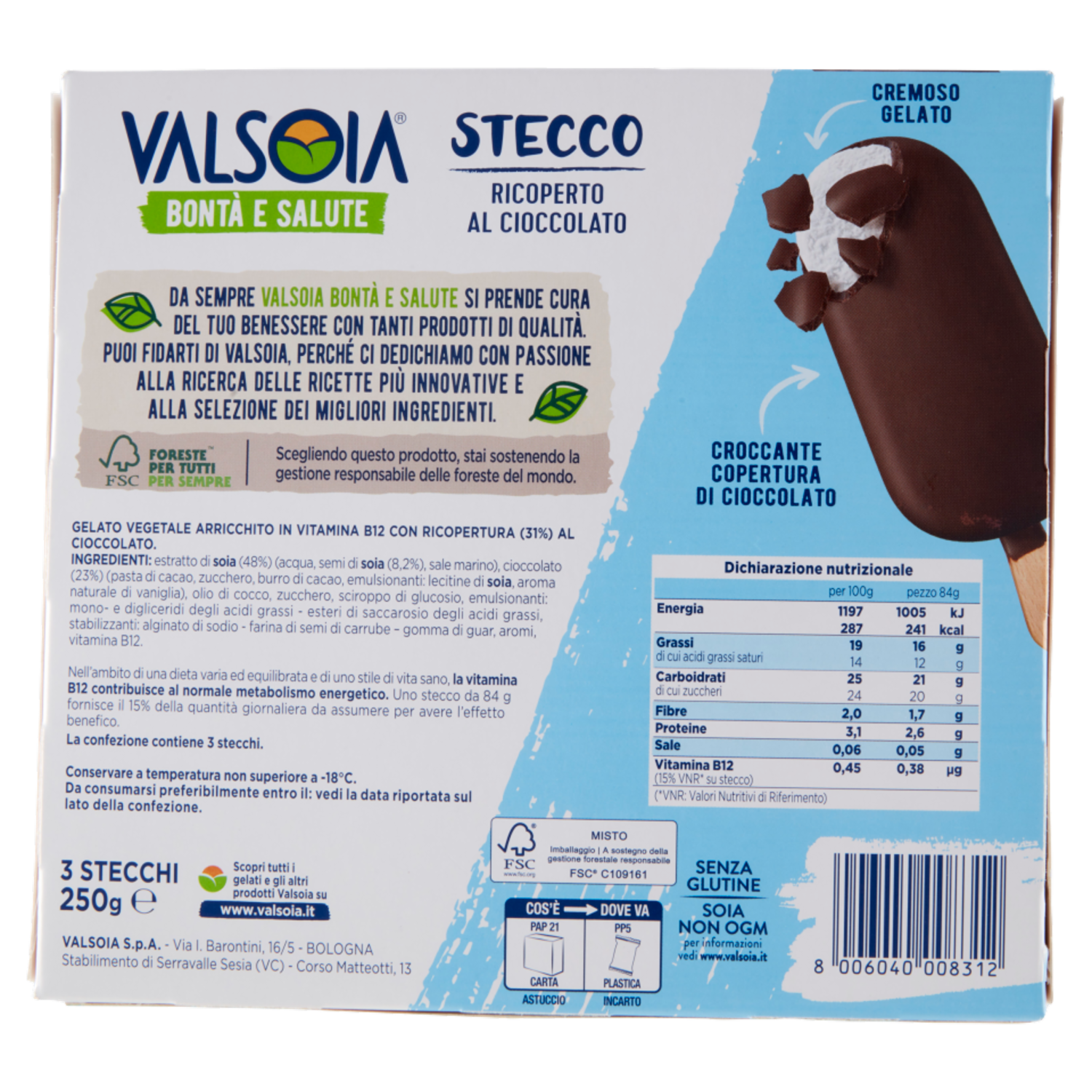 Valsoia Bontà e Salute Stecco Ricoperto al Cioccolato 3 x 84 g