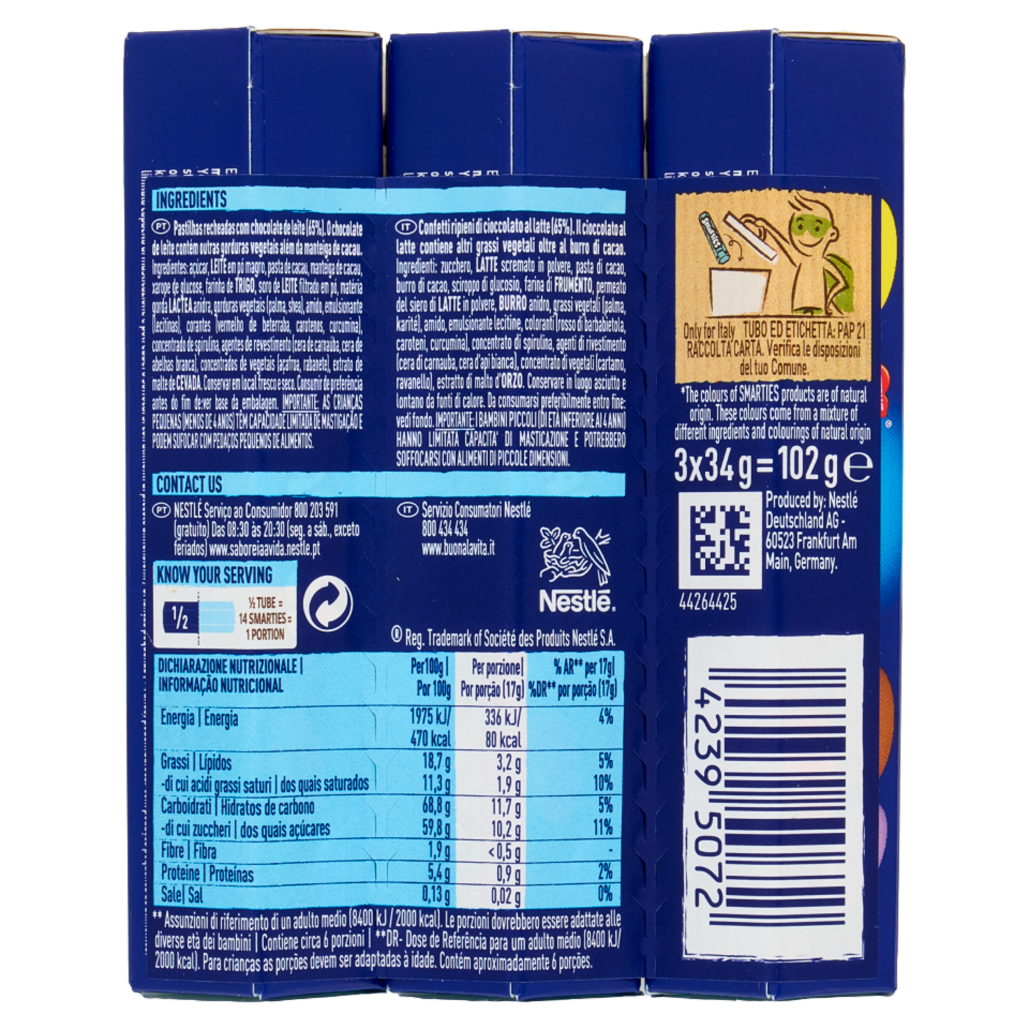 SMARTIES Confetti ripieni di Cioccolato al Latte 3 Tubi da 34g
