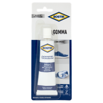 Applicazioni Ideale per incollare, riempire e riparare gomma, pelle, tessuto, neoprene, vari materiali sintetici (come Hypalon), legno, metallo o ceramica. Ottimo per riparare scarpe (sportive), suole e tacchi, stivali, guanti, ciabatte, oggetti gonfiabili (come barche, materassi ad aria) in gomma, abbigliamento antipioggia, borse da viaggio, mute, attrezzi da immersione, tende, selle (di cavalli), materiali decorativi, fari e per rinforzare le guarnizioni in gomma di elettrodomestici, utensili, auto, caravans e roulotte. Istruzioni per l'uso 1 Carteggiare il materiale. Assicurarsi che entrambe le superfici siano pulite, asciutte e prive di polvere e grasso. 2. Applicare uno strato di colla di circa 2 mm. Per riparazioni importanti, incollare la garza inclusa nella confezione e applicare un altro strato di colla. 3. Lisciare l'adesivo con la spatola in dotazione. Resistenza massima raggiunta dopo 48 ore, in funzione dei materiali e delle condizioni ambientali. Importante Non utilizzare a temperature inferiori a +5°C. Conservare in luogo fresco, al riparo dal gelo e ben chiuso. Conservazione 24 mesi. Non adatto per Polipropilene (PP), Polietilene (PE) e P.T.F.E. Nel tempo, la colla potrebbe mostrare ingiallimento. Consultare la scheda tecnica per istruzioni dettagliate su www.bostik.it.