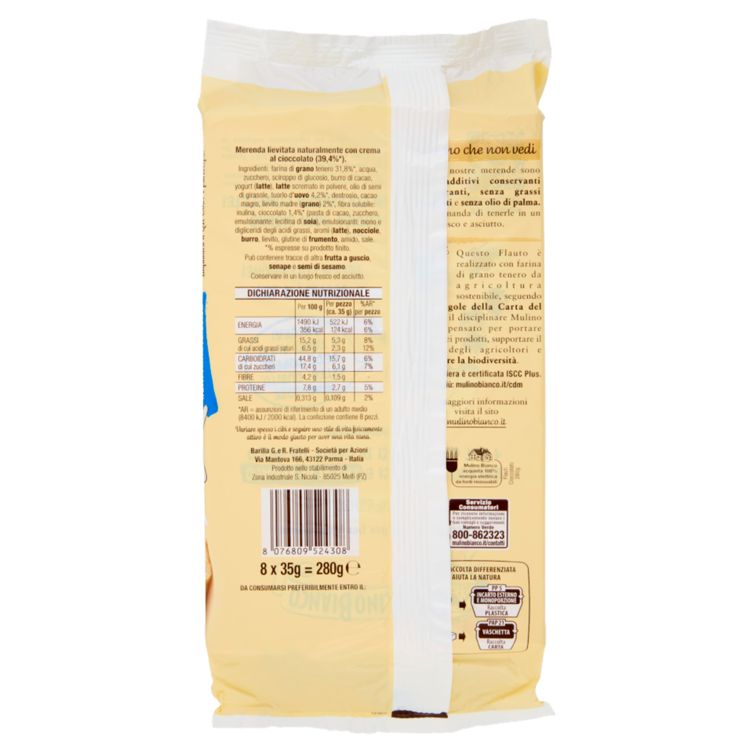 Mulino Bianco Flauti Cioccolato Merenda senza Additivi Conservanti 8 pezzi 280g