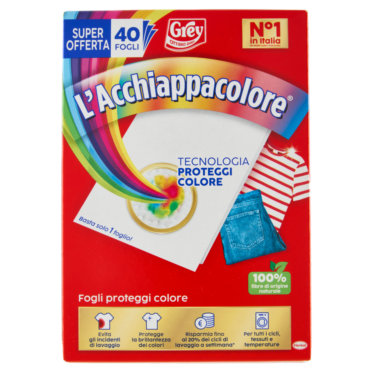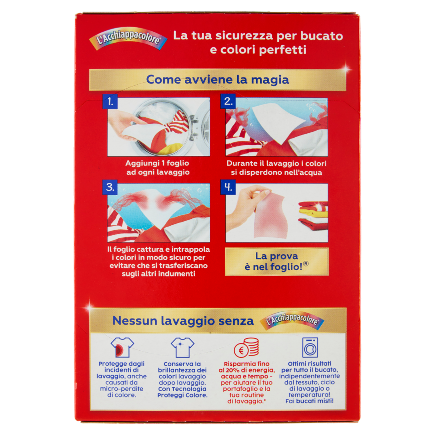 La tua sicurezza per bucato e colori perfetti Nessun lavaggio senza L'Acchiappacolore Protegge dagli incidenti di lavaggio, anche causati da micro-perdite di colore. Conserva la brillantezza dei colori lavaggio dopo lavaggio. Con Tecnologia Proteggi Colore. Risparmia fino al 20% di energia, acqua e tempo - per aiutare il tuo portafoglio e la tua routine di lavaggio.* Ottimi risultati per tutto il bucato, indipendentemente dal tessuto, ciclo di lavaggio o temperatura! Fai bucati misti! *Simulazione del Prof. Stamminger, Università di Bonn Il foglio è realizzato con fibre biodegradabili e 100% di origine naturale La confezione è realizzata al 100% con carta riciclata e completamente riciclabile I bucati misti ti permettono di ridurre i lavaggi, risparmiando tempo, acqua ed energia.