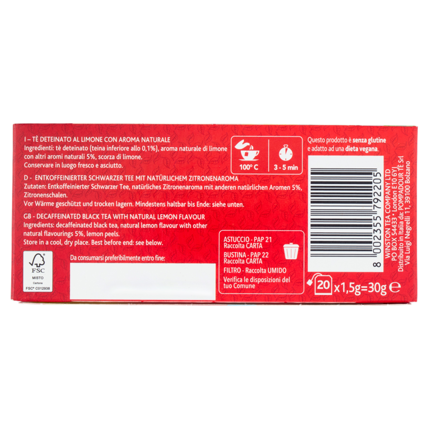 Sir Winston Tea Tè al Limone Deteinato 20 x 1,5 g
