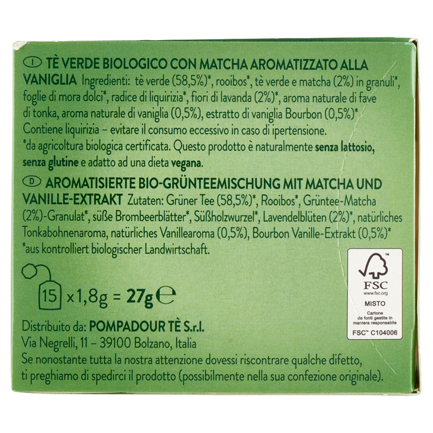 Pompadour NamasTe Tè Ayurvedico Biologico Tè Verde con Matcha 15 x 1,8 g