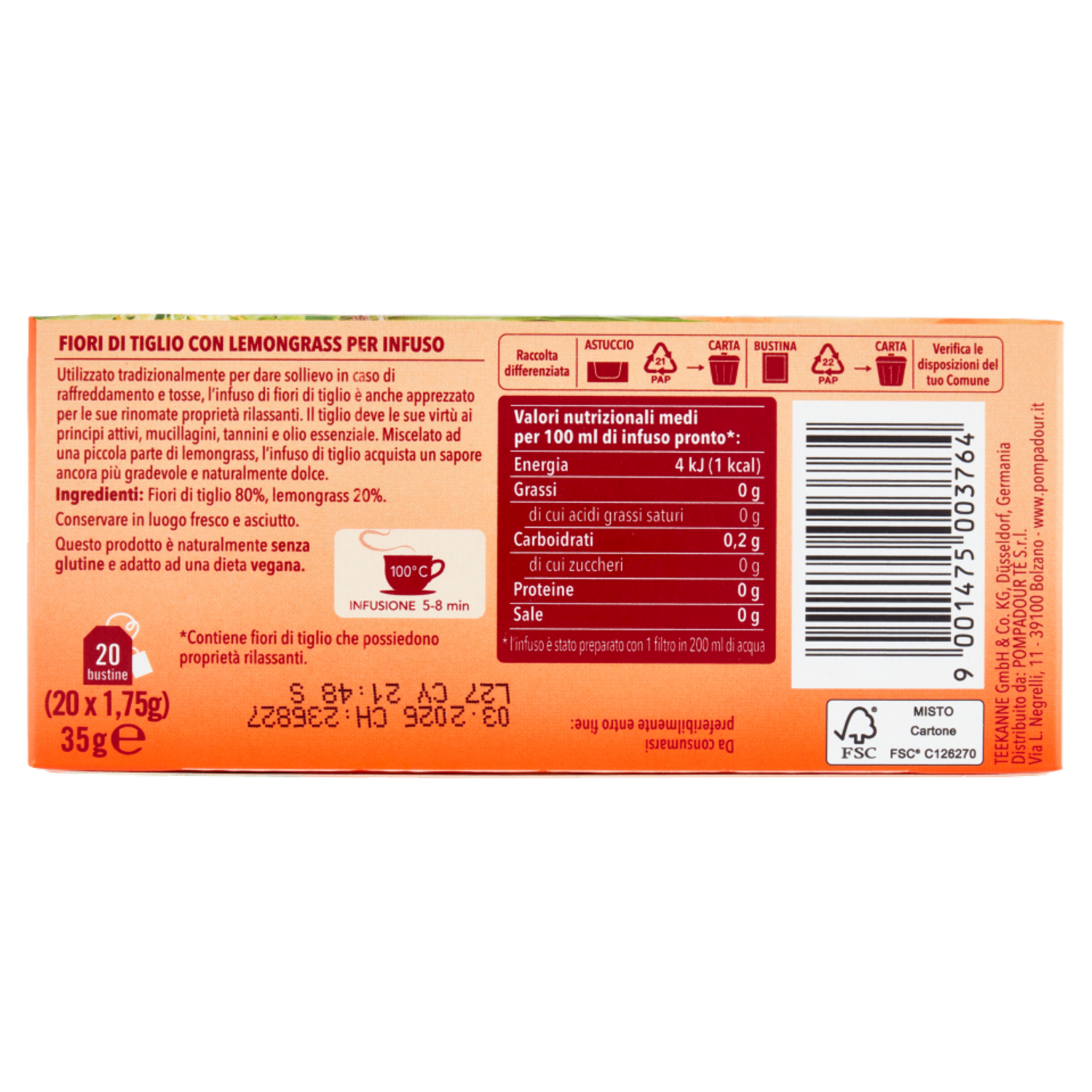 Pompadour Infuso Fiori di Tiglio con Lemongrass bustine 20 x 1,75 g