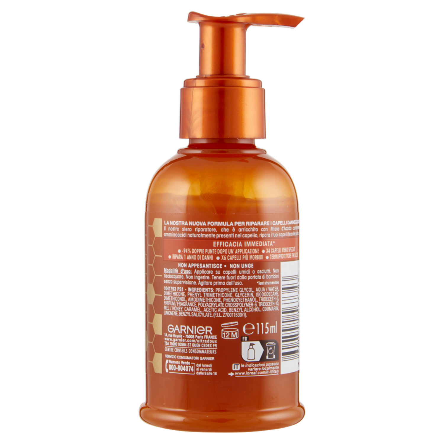 Garnier Ultra Dolce Elisir di Miele, Siero Riparatore, Capelli Danneggiati, 115 ml