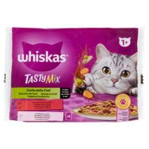 Whiskas Tasty Mix Scelta dello Chef in salsa con manzo pollame e verdure, con salmone e carote 4x85g