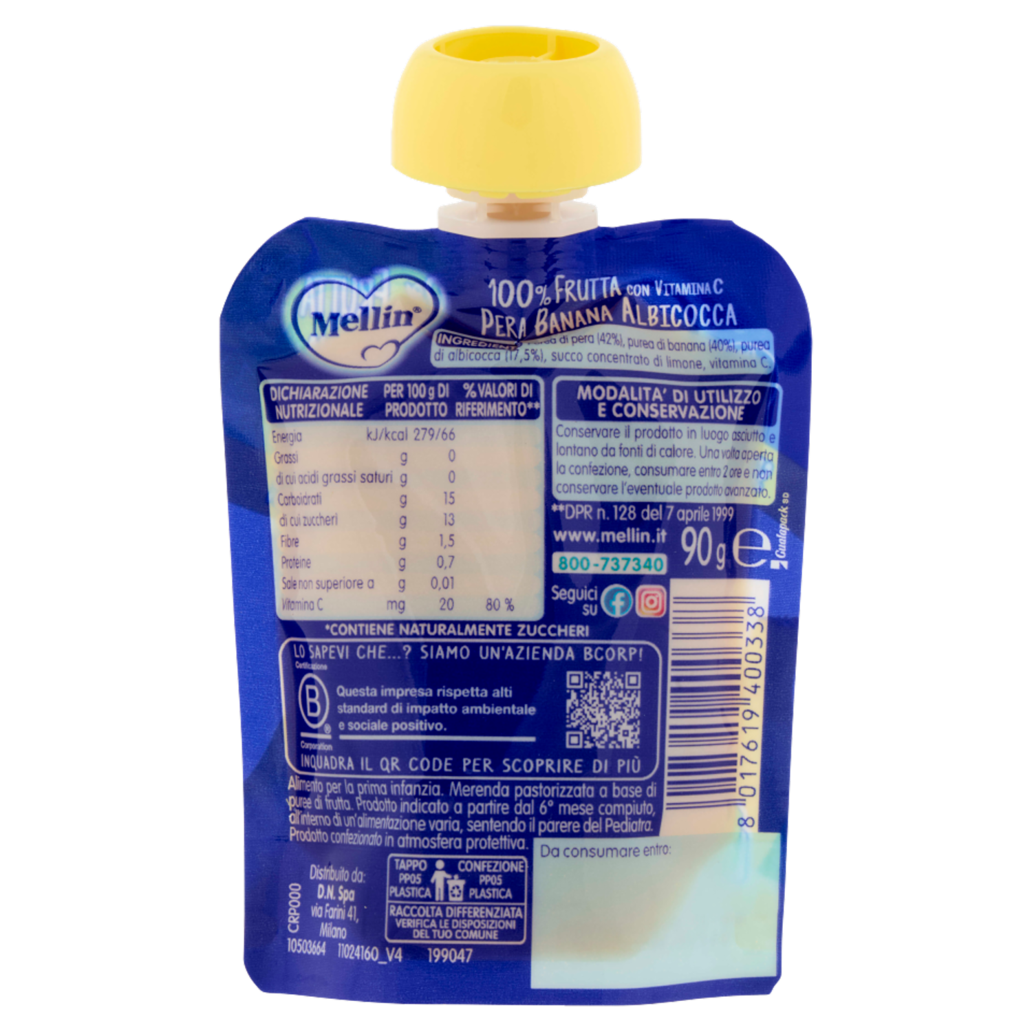 MELLIN Merenda di Frutta 100% con Vitamina C, Albicocca, a partire dal 6° mese, Pouch 90 g