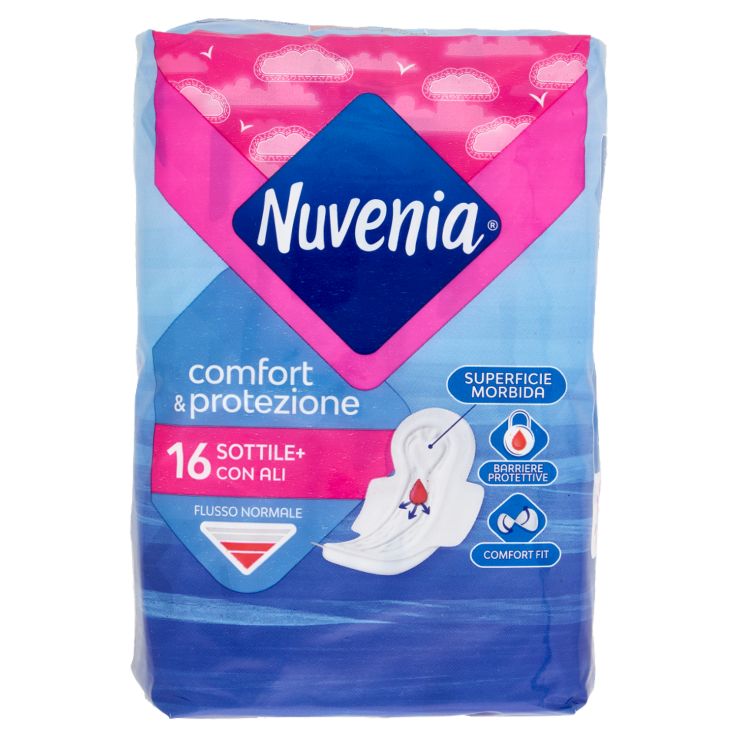Composizione prodotto: strato superiore in polipropilene, cuore assorbente in polpa di cellulosa, strato inferiore in polietilene, adesivo. Per maggiori informazioni visitare il sito www.nuvenia.it