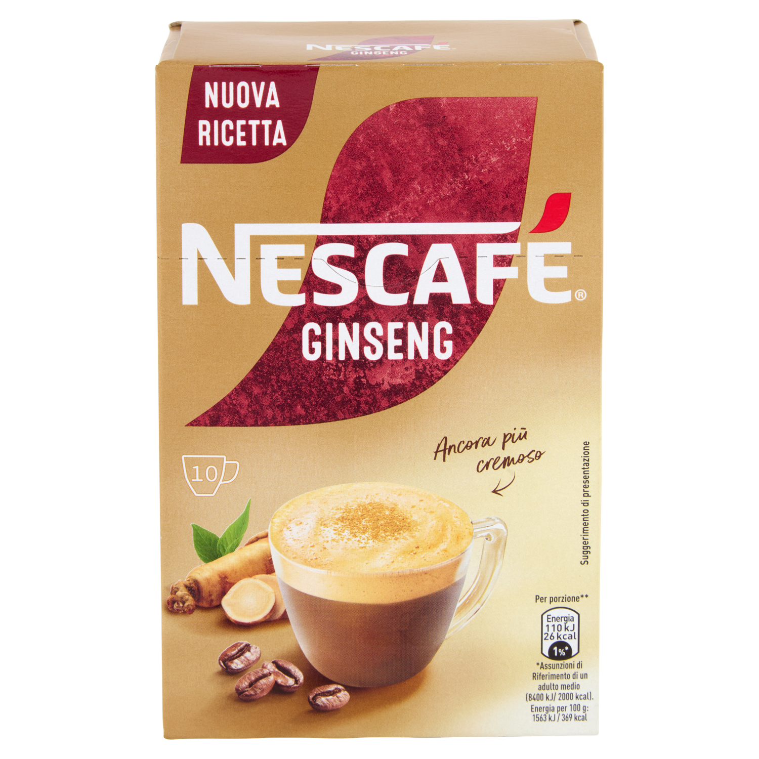 C'è molto di più in ogni tazza. Il caffè di questa confezione di NESCAFÉ proviene al 100% da fonti responsabili e supporta i coltivatori nel migliorare le loro terre e le loro condizioni di vita. Scopri di più sulle nostre iniziative di approvvigionamento responsabile scannerizzando il QR code su questa confezione o su nescafe.it/sostenibilità #Nescafeplan2030 Prova l'irresistibile NESCAFÉ Ginseng. Il perfetto mix per le tue pause golose: chicchi di caffè Arabica e Robusta, vellutata schiuma di latte ed estratto di radice di ginseng. Senza glutine - Nuova ricetta - 10 Tazze - Ancora più cremoso