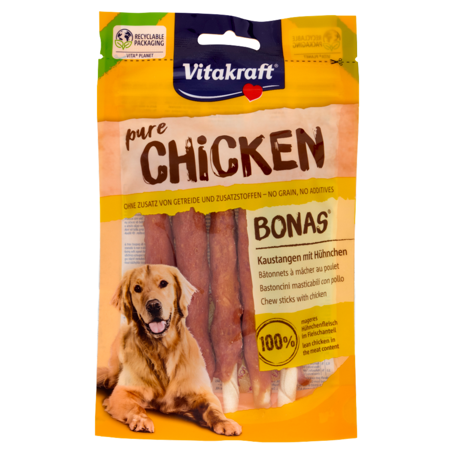 Gustosi bastoncini da masticare, avvolti in deliziosa carne di pollo. - Senza aggiunta di zucchero, soia, cereali, uova, prodotti lattiero-caseari e farine di carne. - Senza l'aggiunta di conservanti, coloranti ed esaltatori di sapidità artificiali.