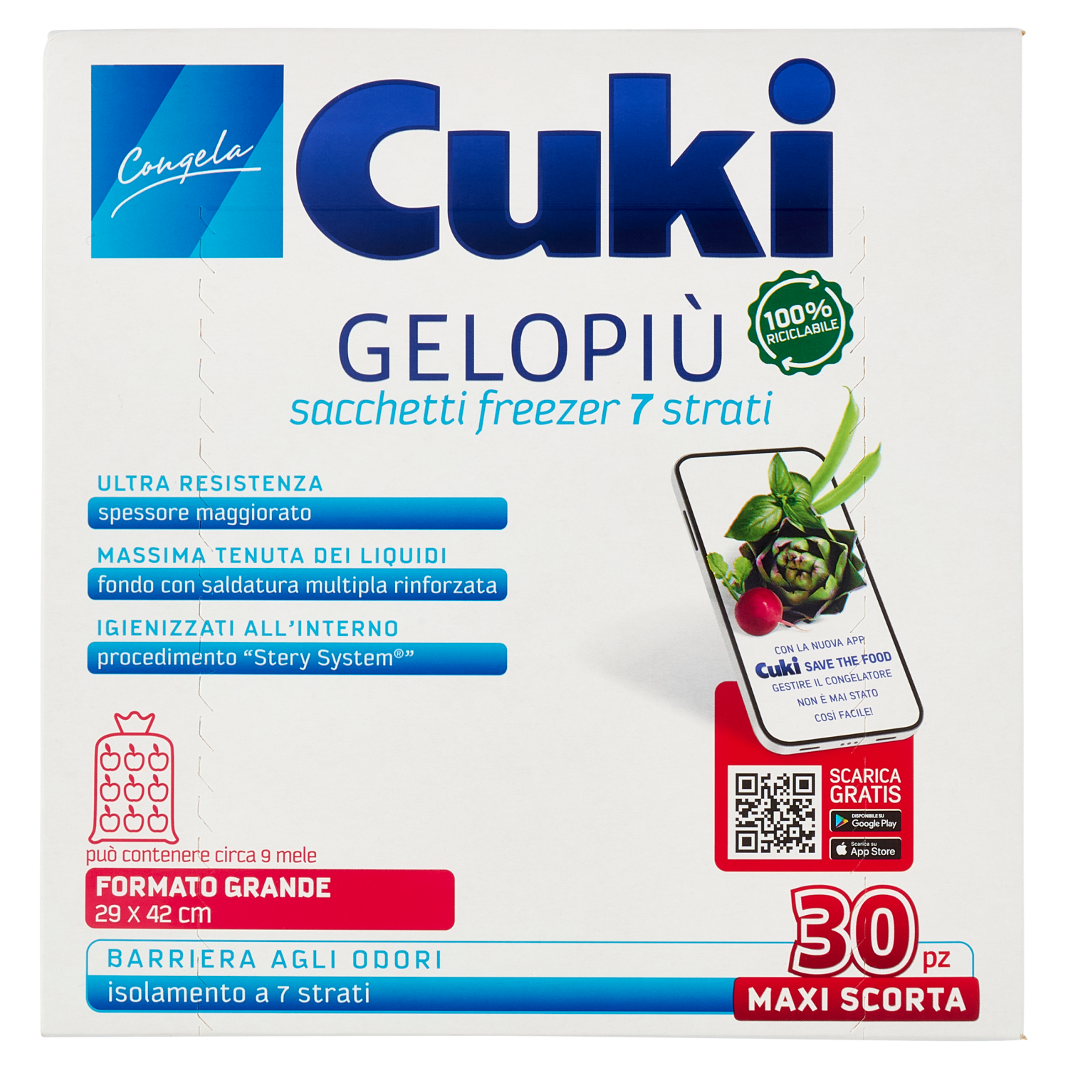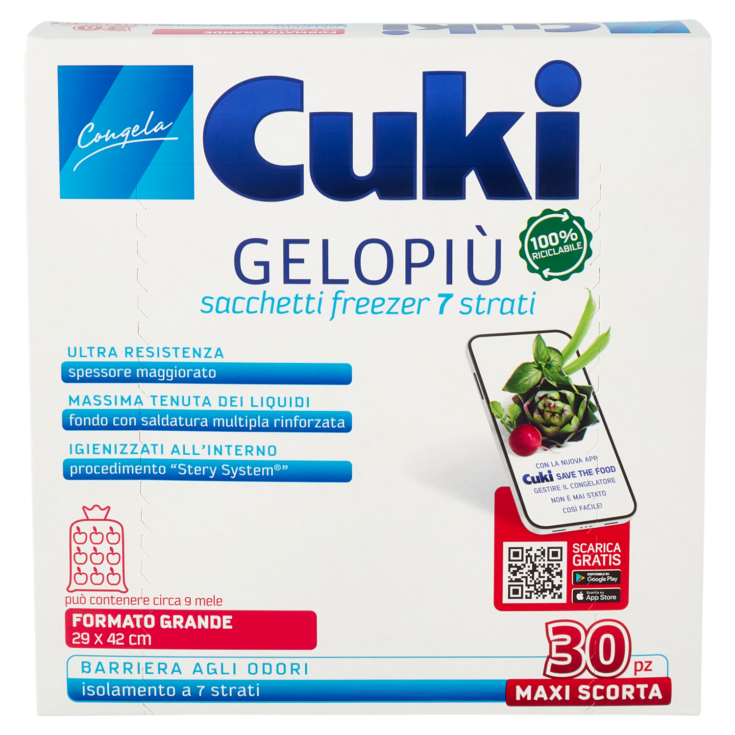 Cuki Congela Gelopiù sacchetti freezer 7 strati Formato Grande 29 x 42 cm 30 pz