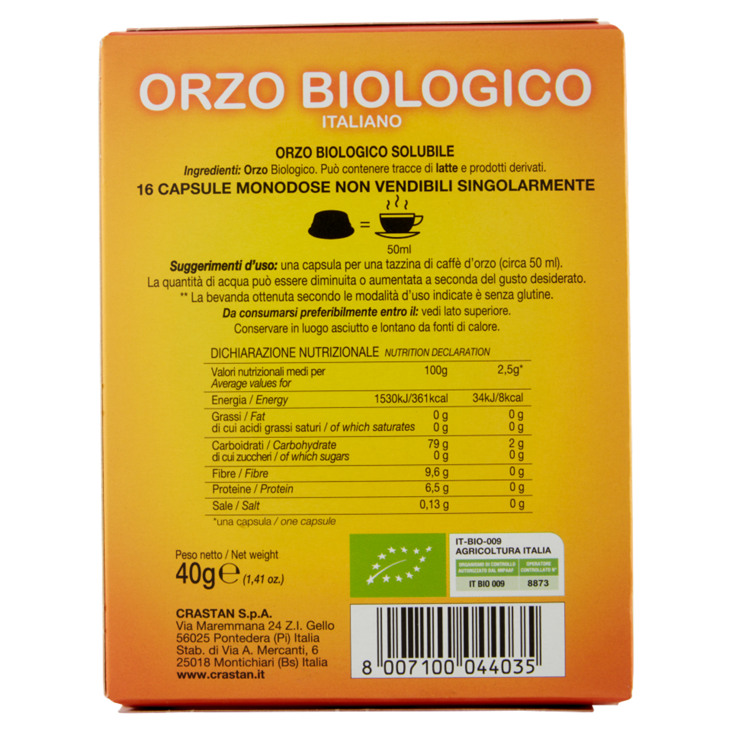 Crastan Bio Orzo Biologico Italiano Capsule Compatibili Lavazza A Modo Mio* 16 x 2,5 g