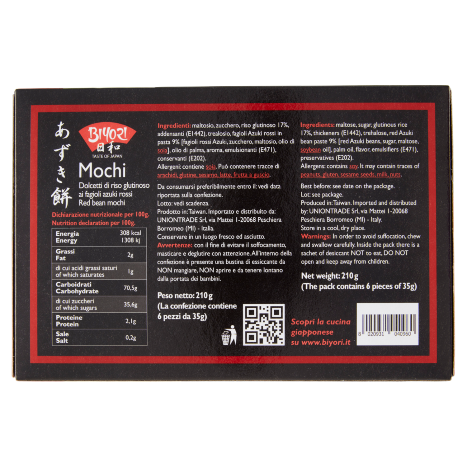 Biyori Mochi Dolcetti di riso glutinoso ai fagioli azuki rossi 6 x 35 g