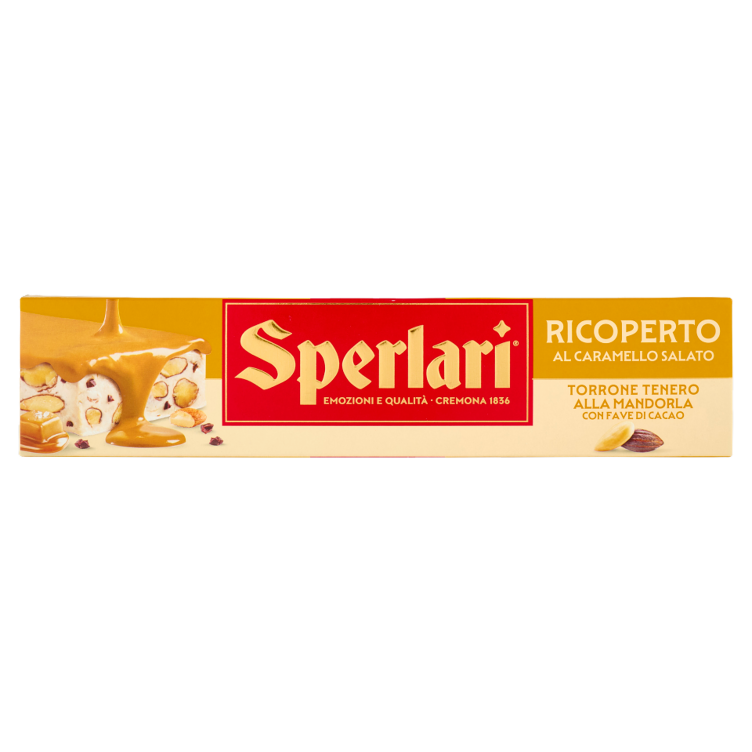 Sperlari Ricoperto al Caramello Salato Torrone Tenero alla Mandorla con Fave di Cacao 200 g