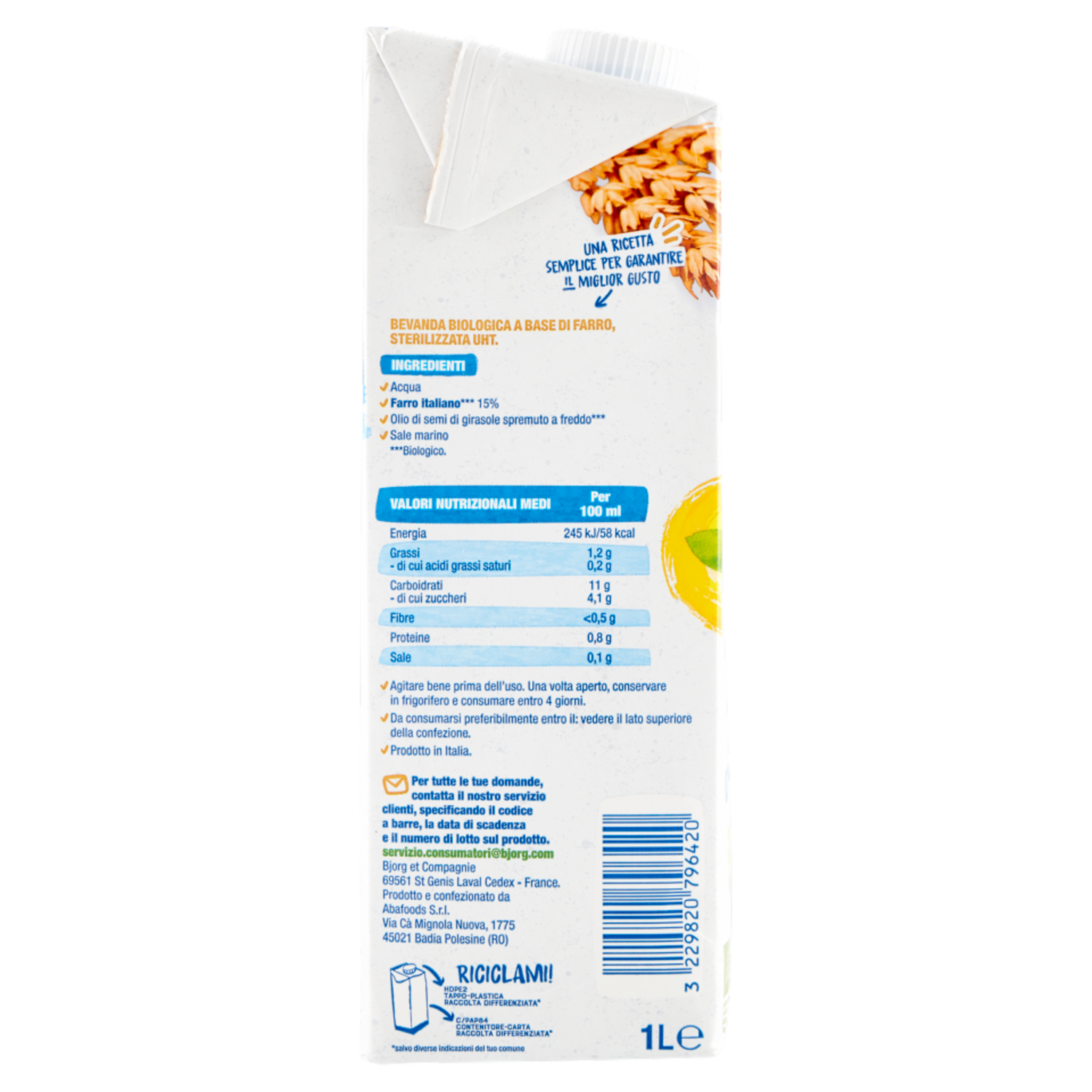 BJORG Farro Bevanda Vegetale Bio, Farro Italiano, Senza Zuccheri Aggiunti, Prodotto in Italia, 1L