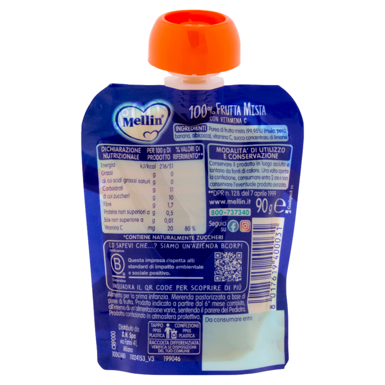 MELLIN Merenda di Frutta 100% Frutta Mista con Mela, Pera, Banana Albicocca, dal 6° mese, Pouch 90 g