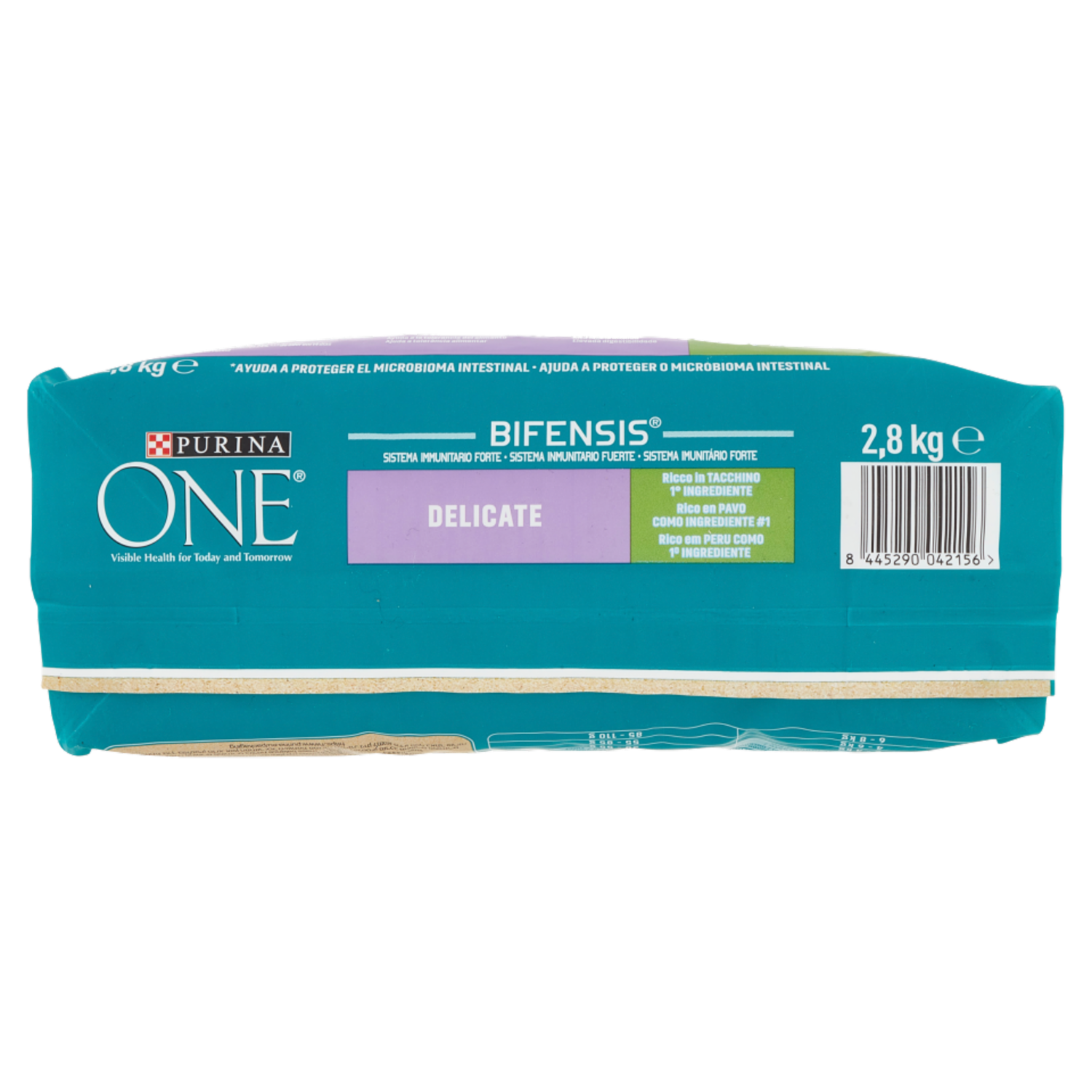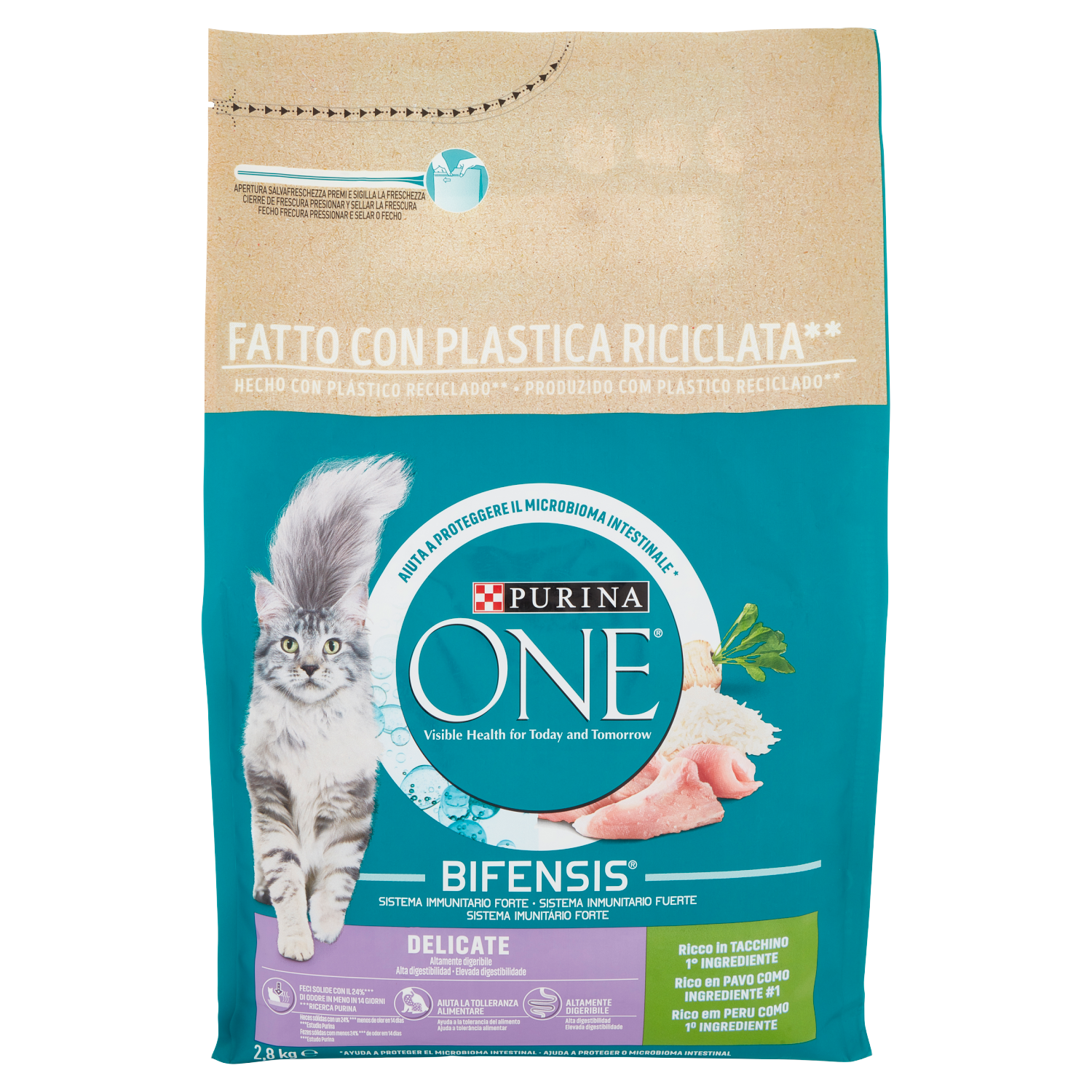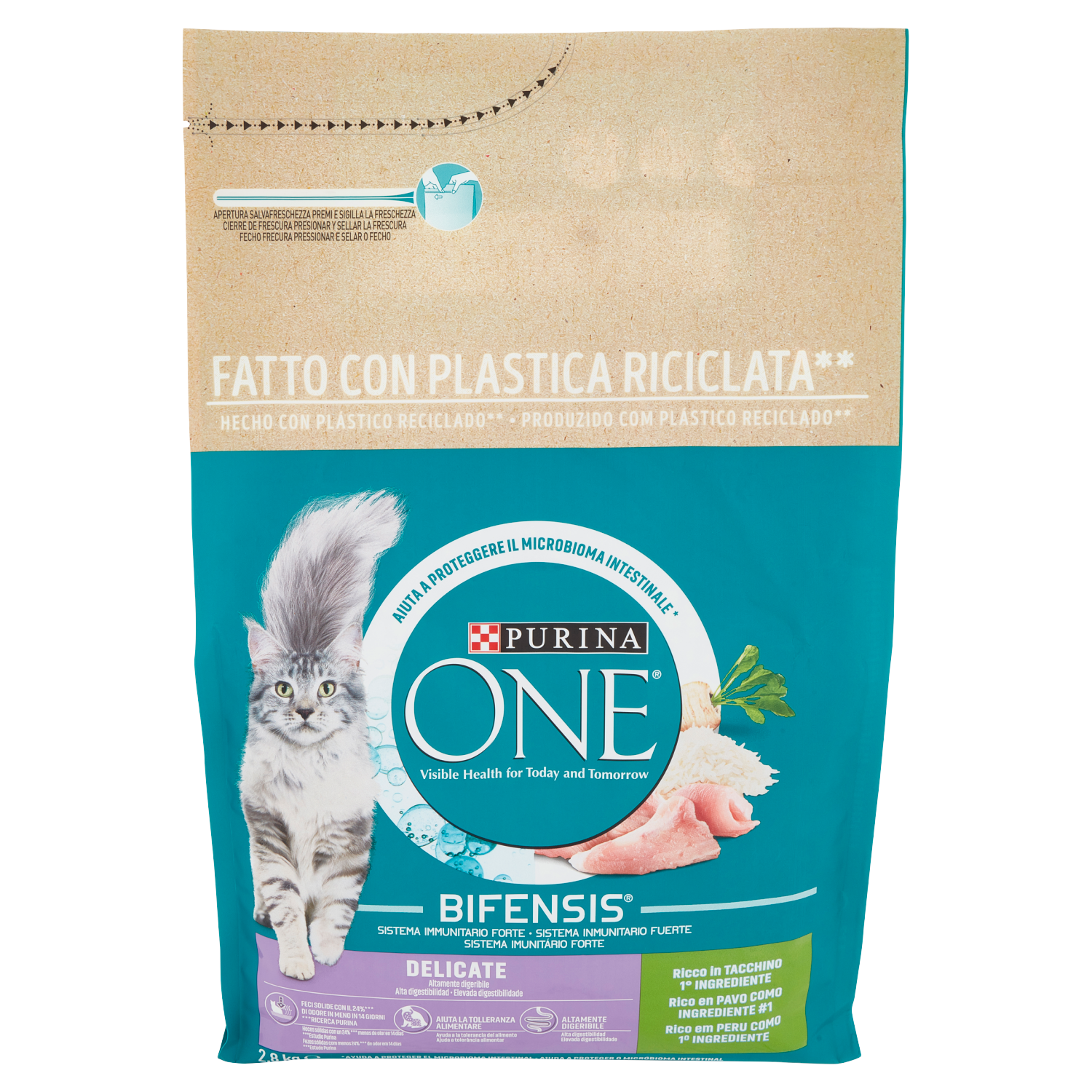 Sviluppato dai veterinari e dai nutrizionisti Purina Salute visibile oggi e domani Purina One Delicate è specificamente formulato per la salute e il benessere dei gatti con digestione sensibile e appetito delicato. L'equilibrio del microbioma intestinale è essenziale per la salute del tuo gatto e ha un impatto diretto sul suo sistema immunitario. Il microbioma è un ecosistema formato da miliardi di microorganismi che vivono nell'intestino e che sono unici per ogni gatto. L'equilibrio dei microorganismi è importante per garantire un effetto positivo sulla salute digestiva del tuo gatto, sul suo sistema immunitario e sul suo benessere generale. PURINA ONE BIFENSIS è una formula nutrizionale con batteri funzionali benefici, i Lactobacilli. É scientificamente dimostrato che supportano il sistema immunitario e aiutano a proteggere la salute del microbioma intestinale del tuo gatto. Aiuta a proteggere il microbioma intestinale Feci solide con il 24%*** di odore in meno in 14 giorni grazie alle fibre naturali Senza l'aggiunta di frumento per aiutare la tolleranza alimentare Altamente digeribile grazie a ingredienti di alta qualità É scientificamente dimostrato supportare il sistema immunitario grazie ai Lactobacilli, specifici batteri funzionali Supporta l'equilibrio del microbioma intestinale grazie al prebiotico cicoria Tacchino è il primo ingrediente - una buona fonte di proteine e amminoacidi per aiutare a mantenere muscoli forti Aiuta a supportare pelle sana e pelo lucido grazie agli acidi grassi Omega 3 & 6 e alle vitamine e minerali essenziali Aiuta a mantenere ossa sane e forti grazie ai minerali e alla vitamina D ***Ricerca Purina Senza l'aggiunta di coloranti - Apertura salvafreschezza premi e sigilla la freschezza - Fatto con plastica riciclata** - Aiuta a proteggere il microbioma intestinale - BIFENSIS - Sistema immunitario forte - Altamente digeribile - Feci solide con il 24%*** di odore in meno in 14 giorni - Aiuta la tolleranza alimentare - Altamente digeribile - Ricco in Tacchino - 1° Ingrediente - ** Il contenuto riciclato di questa confezione viene attribuito utilizzando il sistema del bilancio di massa, che contribuisce all'economia circolare. Questo consente di produrre plastica nuova da una certa quantità di materiale riciclato, riducendo la necessità di plastica vergine. La disponibilità dei sistemi di riciclo può variare da Paese a Paese. Scopri più informazioni su https://www.purina.eu/packaging o inquadra il QR code - ***Ricerca Purina