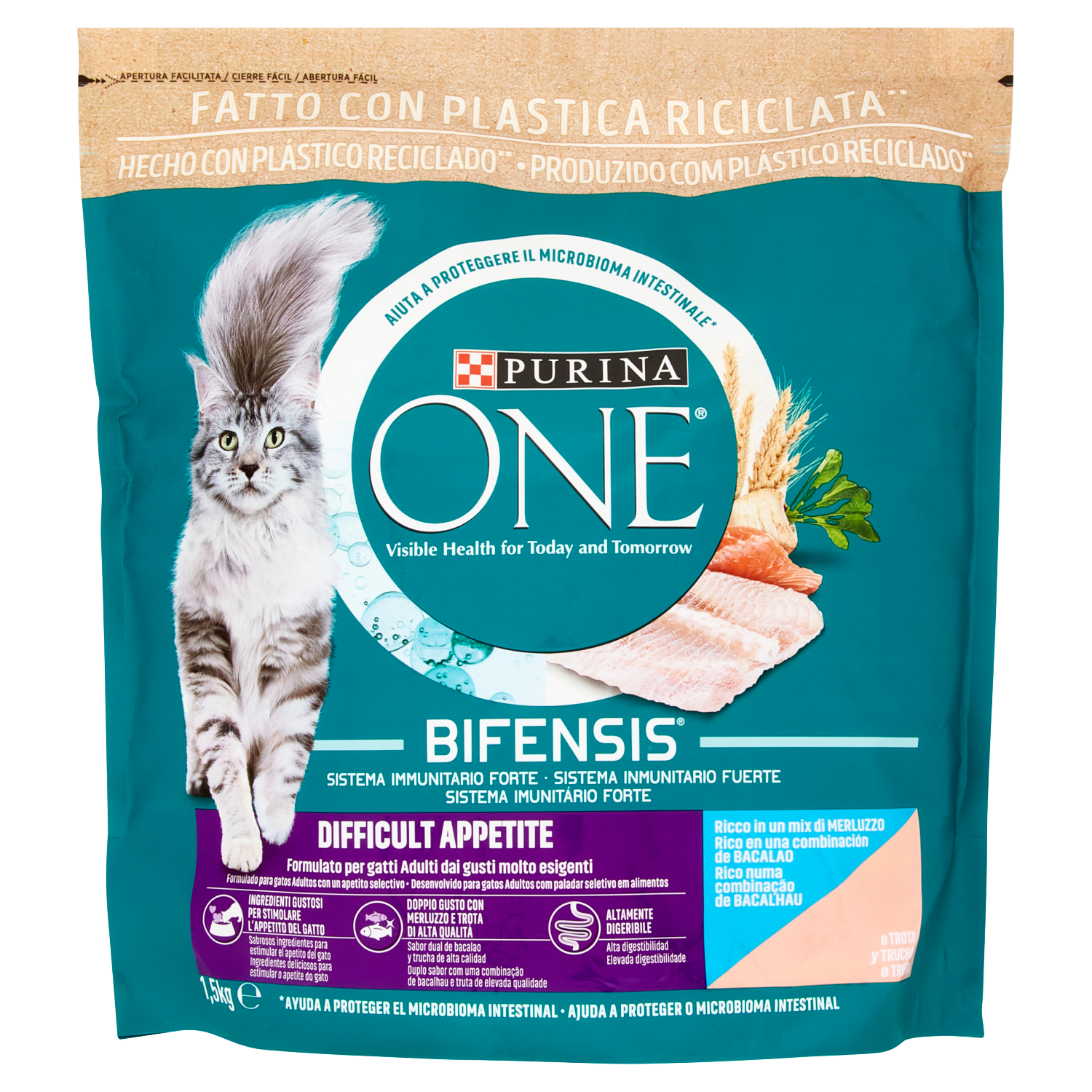 Sviluppato dai veterinari e dai nutrizionisti Purina Salute visibile oggi e domani PURINA ONE Appetito Difficile è specificamente formulato per gatti dai gusti molto esigenti. L'equilibrio del microbioma intestinale è essenziale per la salute del tuo gatto e ha un impatto diretto sul suo sistema immunitario. Il microbioma è un ecosistema formato da miliardi di microorganismi che vivono nell'intestino e che sono unici per ogni gatto. L'equilibrio dei microorganismi è importante per garantire un effetto positivo sulla salute digestiva del tuo gatto, sul suo sistema immunitario e sul suo benessere generale. PURINA ONE BIFENSIS è una formula nutrizionale con batteri funzionali benefici, i Lactobacilli. É scientificamente dimostrato che supportano il sistema immunitario e aiutano a proteggere la salute del microbioma intestinale del tuo gatto. Aiuta a proteggere il microbioma intestinale Aiuta a stimolare l'appetito del gatto grazie a ingredienti gustosi Doppio gusto con merluzzo e trota di alta qualità per fornire proteine e un gusto delizioso Altamente digeribile grazie a ingredienti di alta qualità É scientificamente dimostrato supportare il sistema immunitario del tuo gatto grazie ai Lactobacilli, specifici batteri funzionali Supporta l'equilibrio del microbioma intestinale grazie al prebiotico cicoria Merluzzo é il primo ingrediente - una buona fonte di proteine e amminoacidi per aiutare a mantenere muscoli forti Aiuta a supportare pelle sana e pelo lucido grazie agli acidi grassi Omega 3 & 6 e alle vitamine e minerali essenziali Aiuta a mantenere ossa sane e forti grazie ai minerali e alla vitamina D Senza l'aggiunta di coloranti - Apertura facilitata - Fatto con plastica riciclata** - Aiuta a proteggere il microbioma intestinale - BIFENSIS - Sistema immunitario forte - Formulato per gatti Adulti dai gusti molto esigenti - Ingredienti gustosi per stimolare l'appetito del gatto - Doppio gusto con merluzzo e trota di alta qualità - Altamente digeribile - Ricco in un mix di Merluzzo e Trota - **Il contenuto riciclato di questa confezione viene attribuito utilizzando il sistema del bilancio di massa, che contribuisce all'economia circolare. Questo consente di produrre plastica nuova da una certa quantità di materiale riciclato, riducendo la necessità di plastica vergine. La disponibilità dei sistemi di riciclo può variare da Paese a Paese. Verifica sul nostro sito. Scopri più informazioni su https://www.purina.eu/packaging o clicca sul QR code