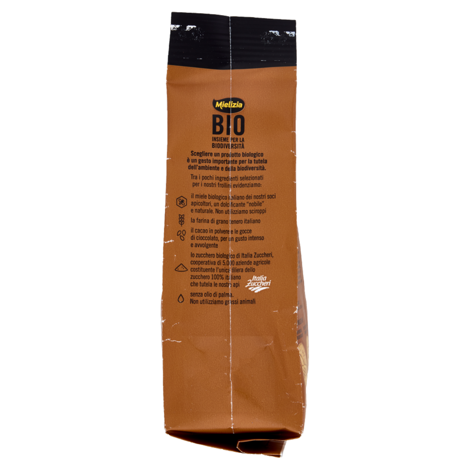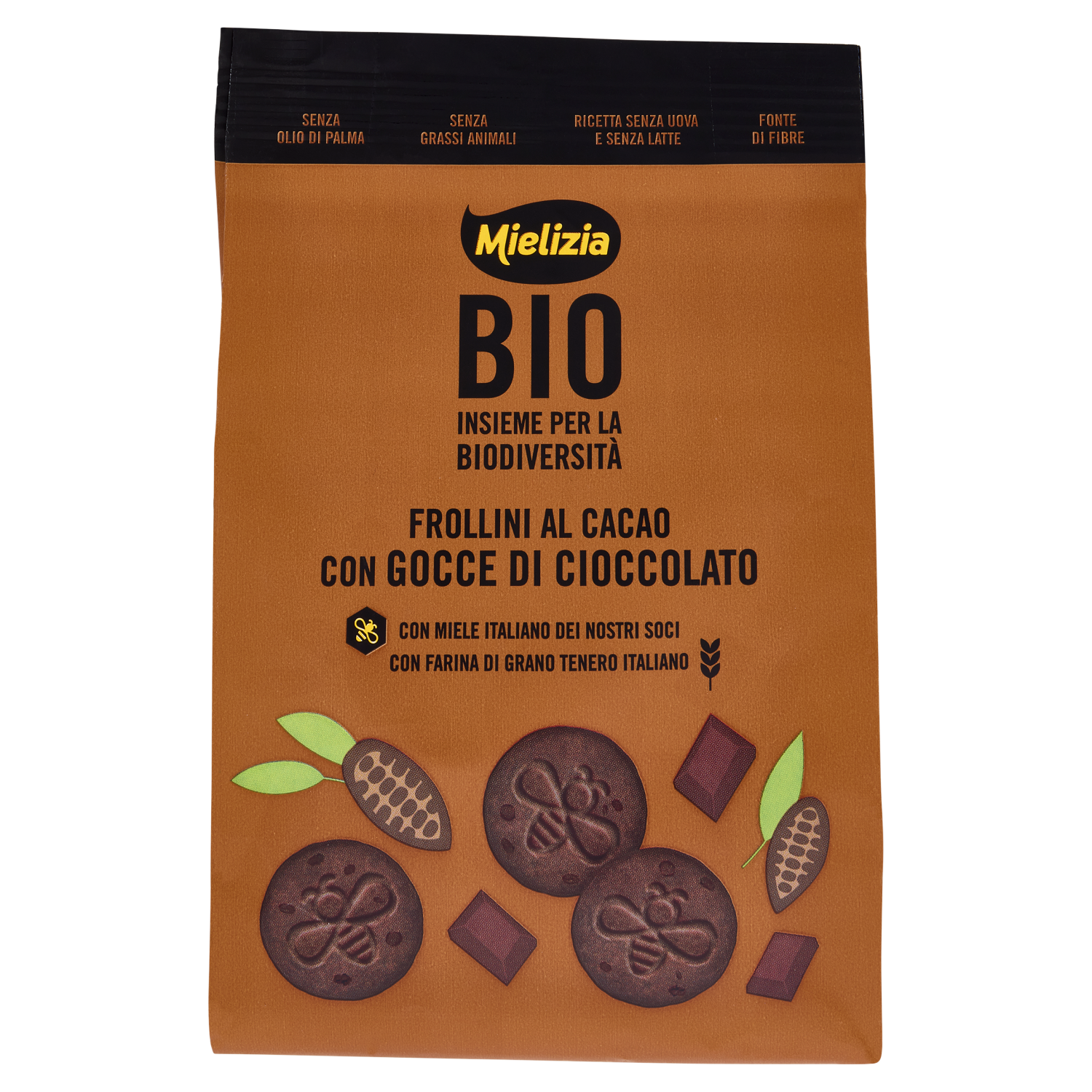 Con zucchero italiano di filiera - Italia Zuccheri Scegliere un prodotto biologico è un gesto importante per la tutela dell'ambiente e della biodiversità. Tra i pochi ingredienti selezionati per i nostri frollini evidenziamo: - il miele biologico italiano dei nostri soci apicoltori, un dolcificante "nobile" e naturale. Non utilizziamo sciroppi - la farina di grano tenero italiano - il cacao in polvere e le gocce di cioccolato, per un gusto intenso e avvolgente - lo zucchero biologico di Italia Zuccheri, cooperativa di 5.000 aziende agricole costituente l'unica filiera dello zucchero 100% italiano che tutela le nostre api - senza olio di palma. Non utilizziamo grassi animali