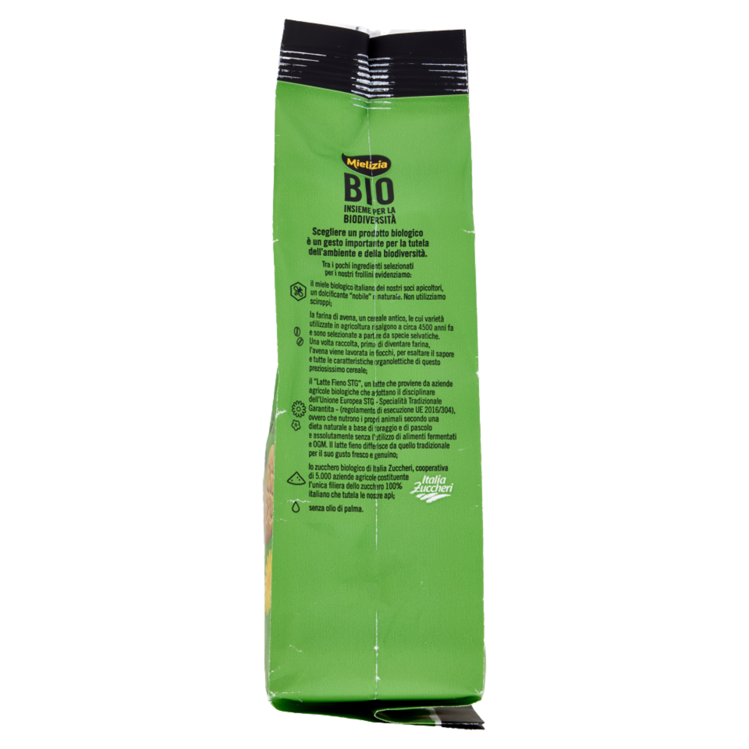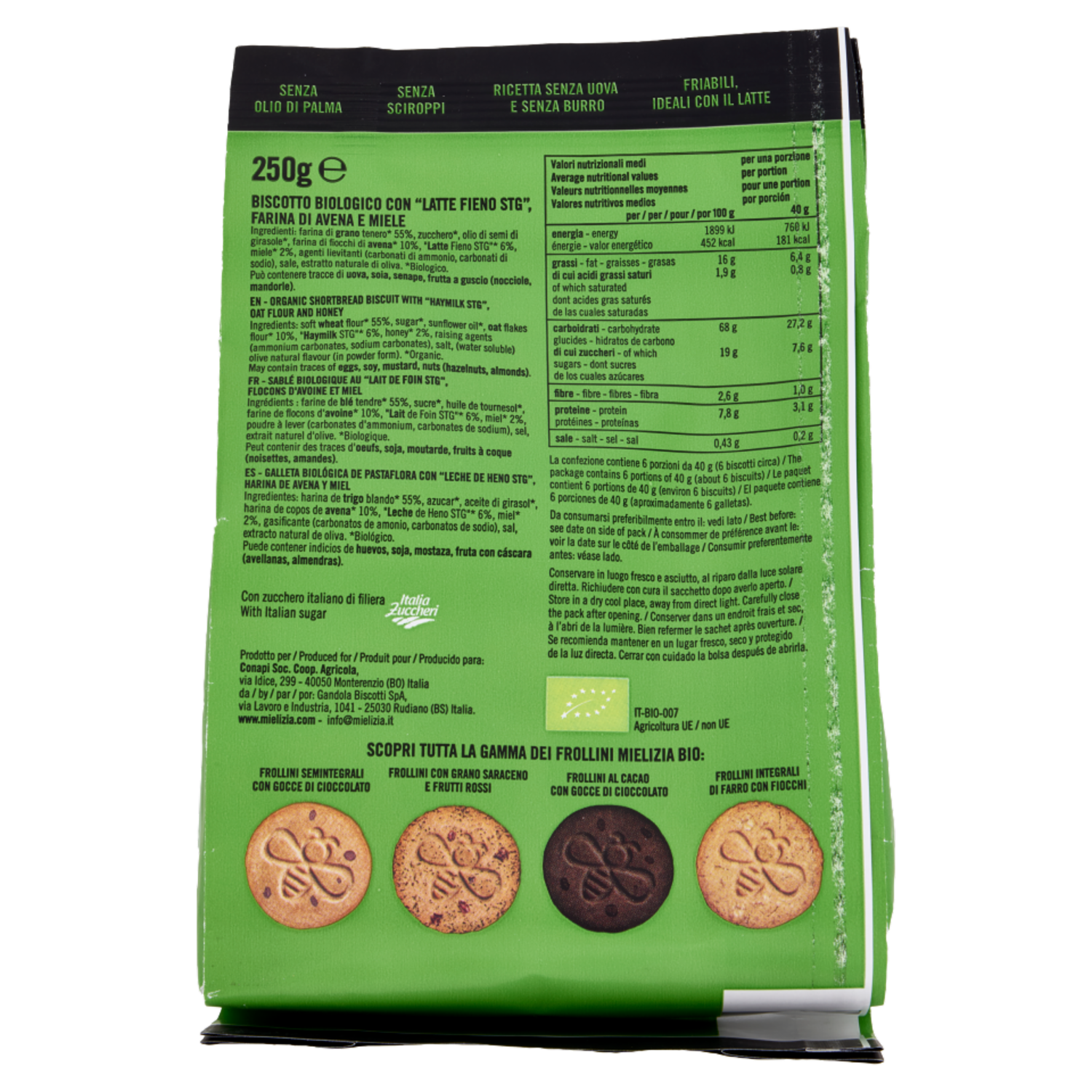 Con zucchero italiano di filiera - Italia Zuccheri Scegliere un prodotto biologico è un gesto importante per la tutela dell'ambiente e della biodiversità. Tra i pochi ingredienti selezionati per i nostri frollini evidenziamo: - il miele biologico italiano dei nostri soci apicoltori, un dolcificante "nobile" naturale. Non utilizziamo sciroppi; - la farina di avena, un cereale antico, le cui varietà utilizzate in agricoltura risalgono a circa 4500 anni fa e sono selezionate a partire da specie selvatiche. Una volta raccolta, prima di diventare farina, l'avena viene lavorata in fiocchi, per esaltare il sapore e tutte le caratteristiche organolettiche di questo preziosissimo cereale; - il "Latte Fieno STG", un latte che proviene da aziende agricole biologiche che adottano il disciplinare dell'Unione Europea STG - Specialità Tradizionale Garantita - (regolamento di esecuzione UE 2016/304), ovvero che nutrono i propri animali secondo una dieta naturale a base di foraggio e di pascolo e assolutamente senza l'utilizzo di alimenti fermentati e OGM. Il latte fieno differisce da quello tradizionale per il suo gusto fresco e genuino; - lo zucchero biologico di Italia Zuccheri, cooperativa di 5.000 aziende agricole costituente l'unica filiera dello zucchero 100% italiano che tutela le nostre api; - senza olio di palma.