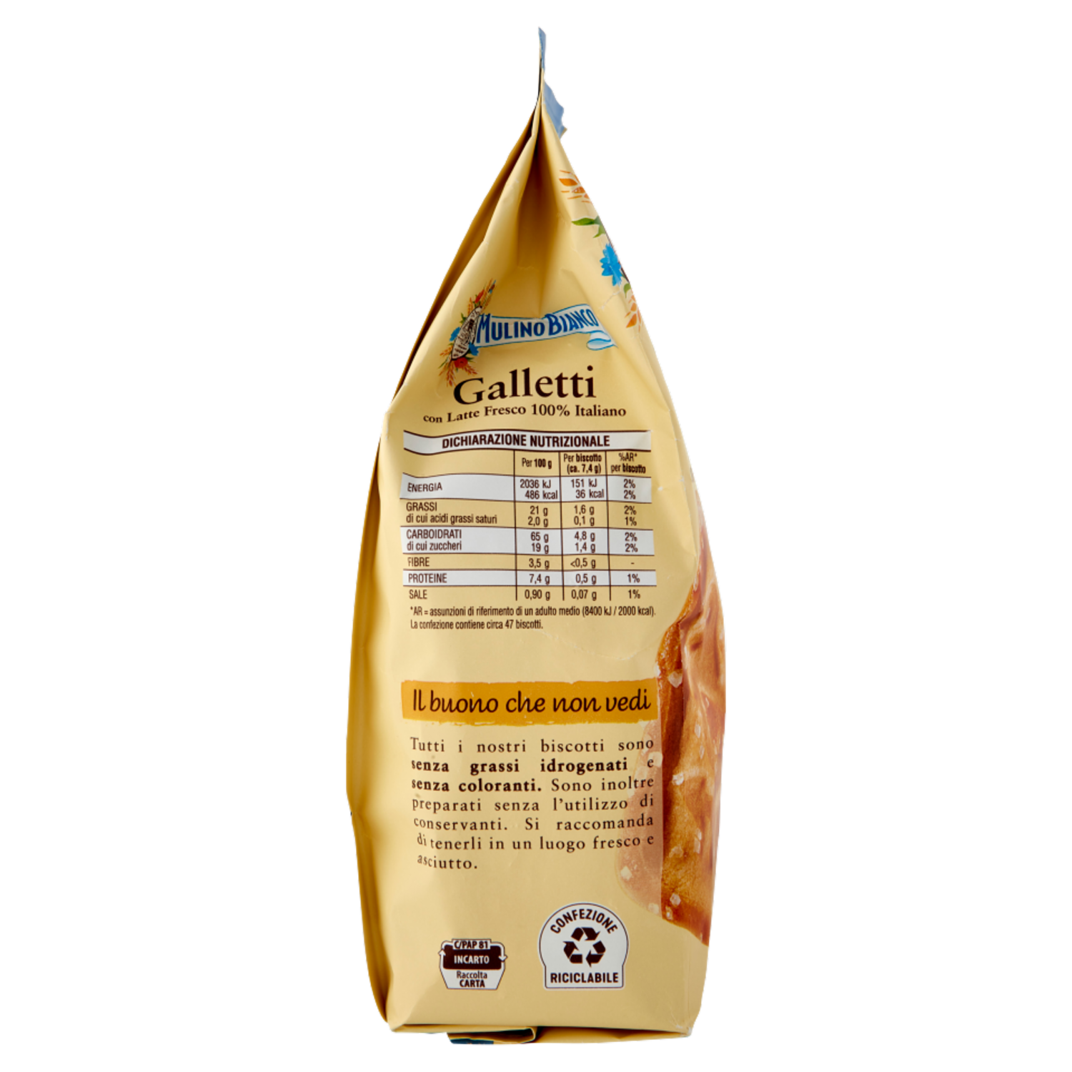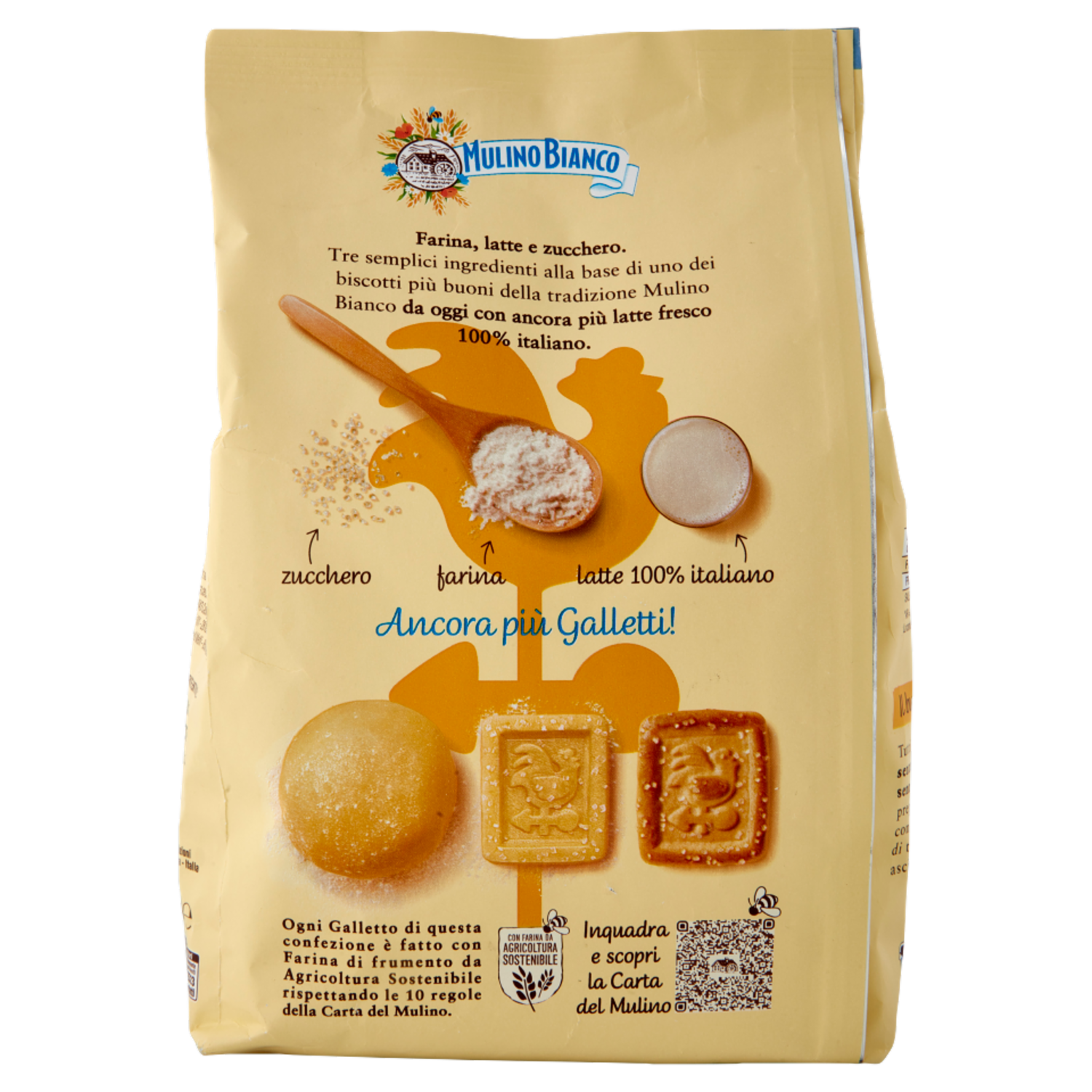 Farina, latte e zucchero. Tre semplici ingredienti alla base di uno dei biscotti più buoni della tradizione Mulino Bianco da oggi con ancora più latte fresco 100% italiano. zucchero - farina - latte 100% italiano Ancora più Galletti! Con farina da agricoltura sostenibile Ogni Galletto di questa confezione è fatto con Farina di frumento da Agricoltura Sostenibile rispettando le 10 regole della Carta del Mulino. Il buono che non vedi Tutti i nostri biscotti sono senza grassi idrogenati e senza coloranti. Sono inoltre preparati senza l'utilizzo di conservanti. Si raccomanda di tenerli in un luogo fresco e asciutto.