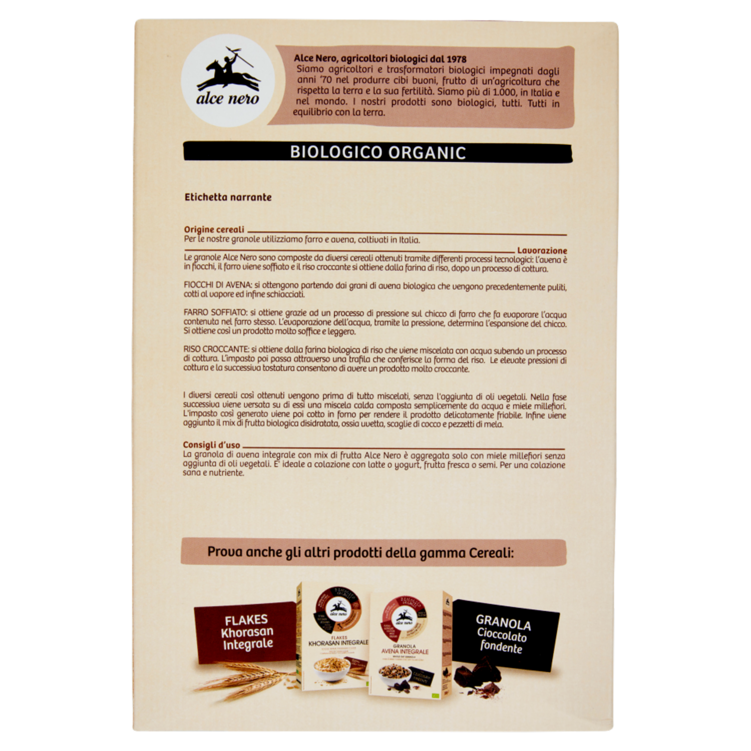 Alce Nero, agricoltori biologici dal 1978 Siamo agricoltori e trasformatori biologici impegnati dagli anni '70 nel produrre cibi buoni, frutto di un'agricoltura che rispetta la terra e la sua fertilità. Siamo più di 1.000, in Italia e nel mondo. I nostri prodotti sono biologici, tutti. Tutti in equilibrio con la terra. Prova anche gli altri prodotti della gamma Cereali: Flakes Khorasan Integrale Granola Cioccolato fondente