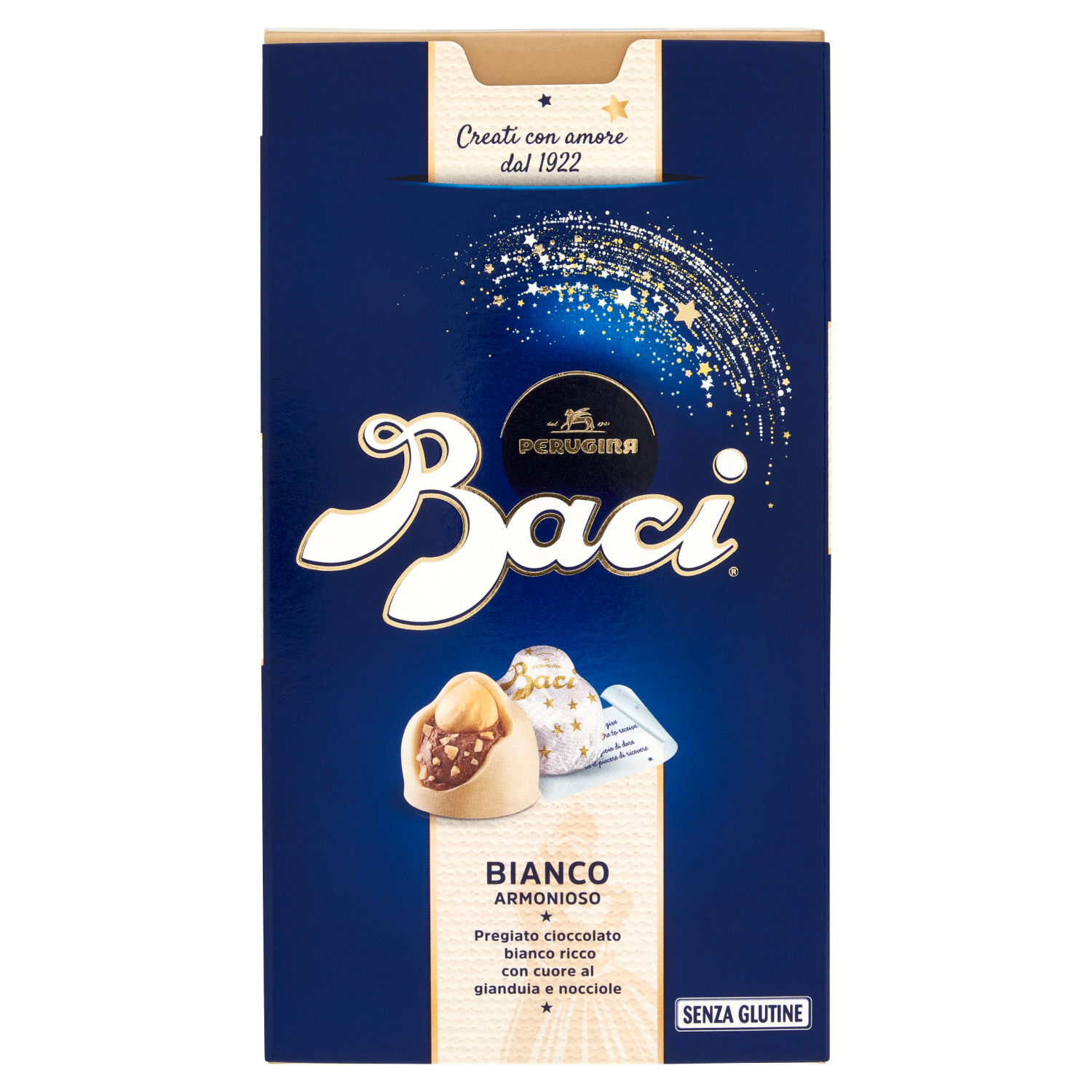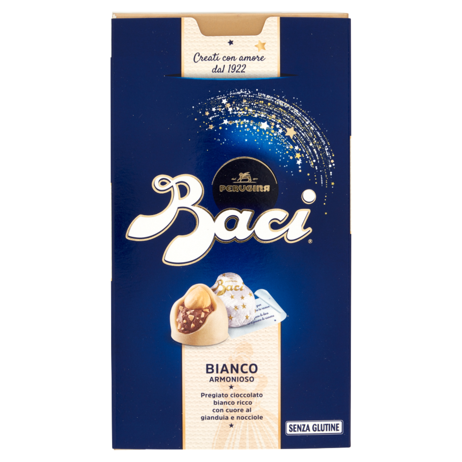 BACI PERUGINA Bianco è molto più che un semplice cioccolatino... è un incontro sorprendente: il morbido cuore al gianduia e granella di nocciola, la croccante nocciola intera, avvolti da ricco cioccolato bianco con vaniglia naturale, per un momento di armonia inattesa e perfetta. Un piccolo capolavoro che custodisce un messaggio... il mondo con cui gli italiani, da sempre, esprimono amore ed affetto. BACI PERUGINA è un semplice gesto, pieno di significati: da condividere, da regalare... o semplicemente da assaporare. Per un'esperienza di piacere nuova, prova BACI PERUGINA anche nei gusti Fondentissimo 70%, Latte Avvolgente e Classico Fondente LUISA. Senza glutine - Creati con amore dal 1922 - Bianco armonioso - Pregiato cioccolato bianco ricco con cuore al gianduia e nocciole - Senza glutine
