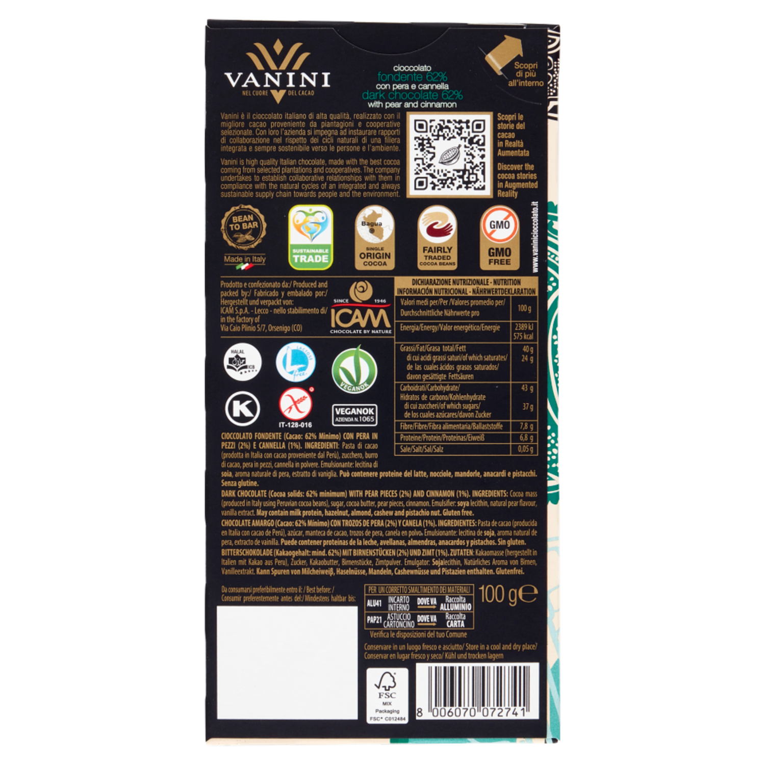 Vanini fondente 62% con pera e cannella 100 g