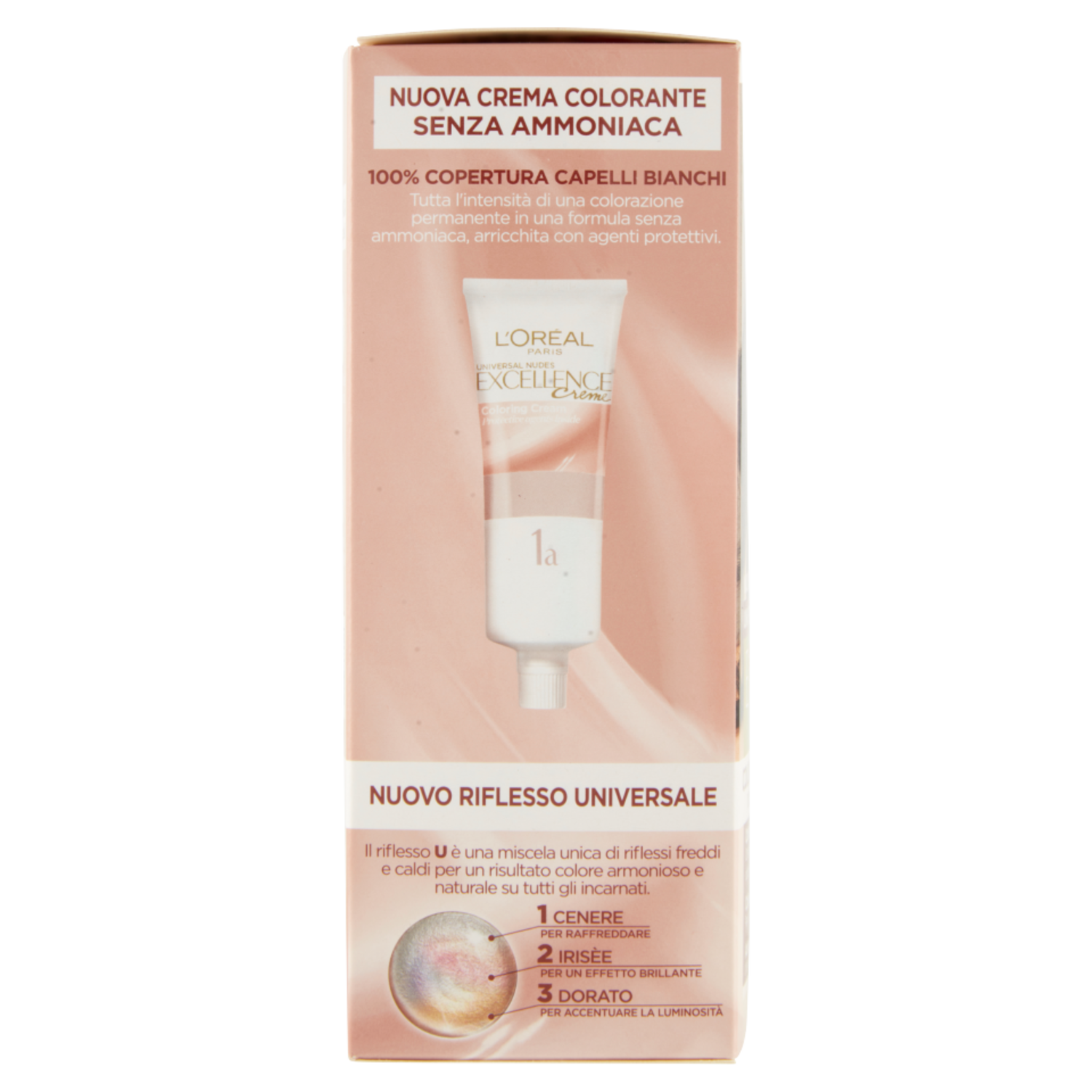Colorazione triplo trattamento senza ammoniaca Trattamento per il colore. Trattamento per la cute*. Trattamento per i capelli. Crema Colorante Protettiva Senza Ammoniaca Arricchita con attivi protettivi, per nutrire i tuoi capelli mentre li colora. Copre il 100% dei capelli bianchi Trattamento Post Colorazione *Shampoo Delicato pH Dolce Deterge delicatamente la cute e i capelli, rimuovendo il colore in eccesso e donando morbidezza al capello. Maschera Nutriente Leggera Arricchita con Ceramide. Nutre a lungo i capelli senza appesantirli. Delicato su cute e capelli Con riflesso universale Nuance che Valorizza ogni tipo di Bellezza Valutato da centinaia di consumatori, questa nuance si adatta ad ogni tipo di incarnato*. Inquadra con il tuo smartphone il QR code e prova la nuance *Testato su capelli con colore naturale e combinazioni di incarnato basate su pubblicazioni scientifiche Nuova crema colorante senza ammoniaca 100% Copertura capelli bianchi Tutta l'intensità di una colorazione permanente in una formula senza ammoniaca, arricchita con agenti protettivi. Nuovo riflesso universale Il riflesso U è una miscela unica di riflessi freddi e caldi per un risultato colore armonioso e naturale su tutti gli incarnati. 1 Cenere per raffreddare 2 Irisèe per un effetto brillante 3 Dorato per accentuare la luminosità