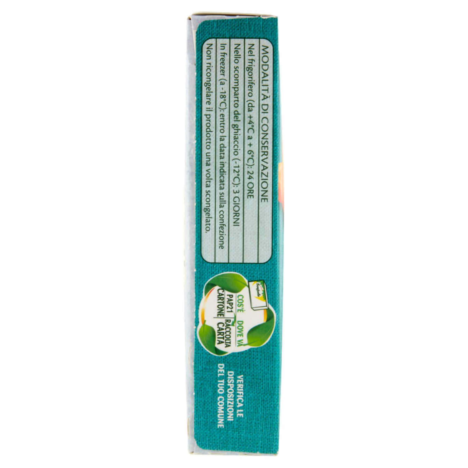 Modalità di conservazione Nel frigorifero (da +4°C a + 6°C): 24 ore Nello scomparto del ghiaccio (-12°C): 3 giorni In freezer (a -18°C): entro la data indicata sulla confezione Non ricongelare il prodotto una volta scongelato.